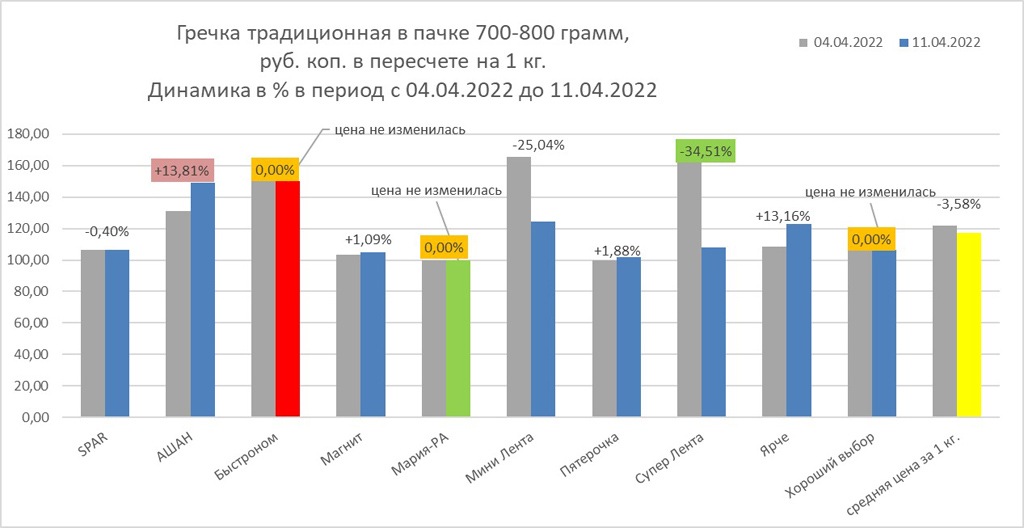 В среднем гречневая крупа подешевела на 3,58%, наибольшее подорожание наблюдалось на 34,51%, в трех наблюдаемых супермаркетах цена на товар не изменилась.