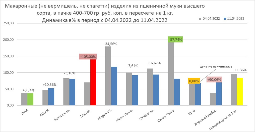Макароны подорожали в двух магазинах практические вдвое. Максимальный рост на самую дешевую позицию в наличии на момент мониторинга показал «Магнит» — 143,45 рублей.