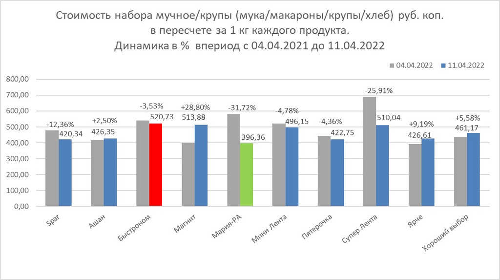 Цены фиксируют в магазинах Spar, «Ашан», «Быстроном», «Магнит», «Мария-Ра», «Мини Лента», «Пятерочка», «Супер Лента», «Ярче» и «Хороший выбор». Принцип выбора товара — самая низкая стоимость в момент проверки.