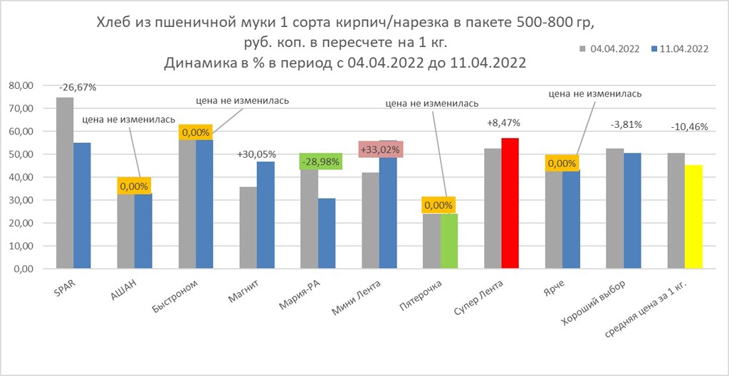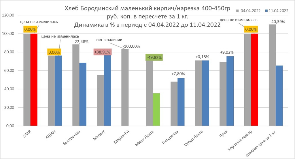 В одном из магазинов удалось найти бородинский хлеб в полтора раза дешевле, чем неделей ранее. В целом средняя цена снизилась также более чем на 40%. На хлеб из пшеничной муки средняя цена также сократилась более чем на 10%.