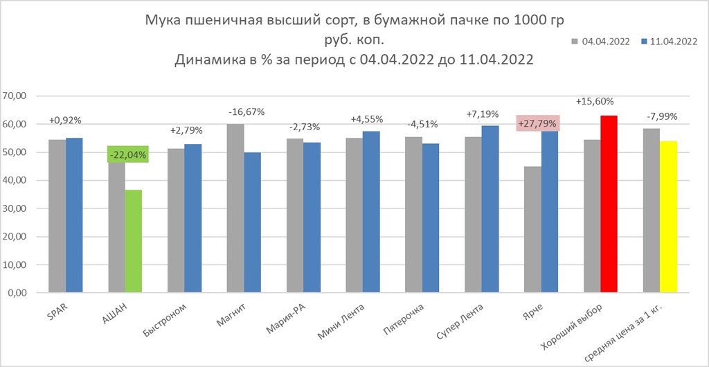 Максимальная цена на муку из дешевых товаров на момент мониторинга наблюдалась в «Хорошем выборе», но наибольший рост в бюджетном сегменте показал «Ярче» — 27,79%.