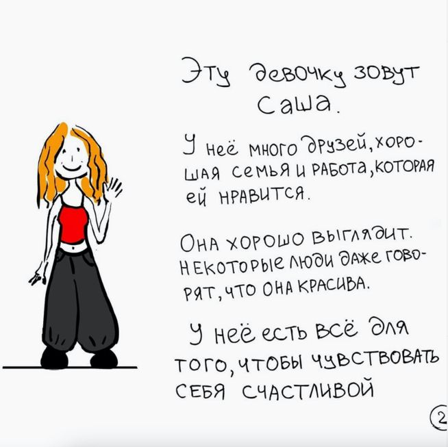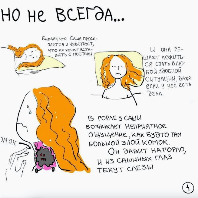 Когда Саша заболела циклотимией — более легкой формой биполярно-аффективного расстройства, — она создала «Книгу о депрессии» — для поддержки людей со схожими проблемами со здоровьем. Книгу перевели на английский и украинский языки. Историю борьбы Саши с болезнью можно прочитать в этом тексте «Бумаги».