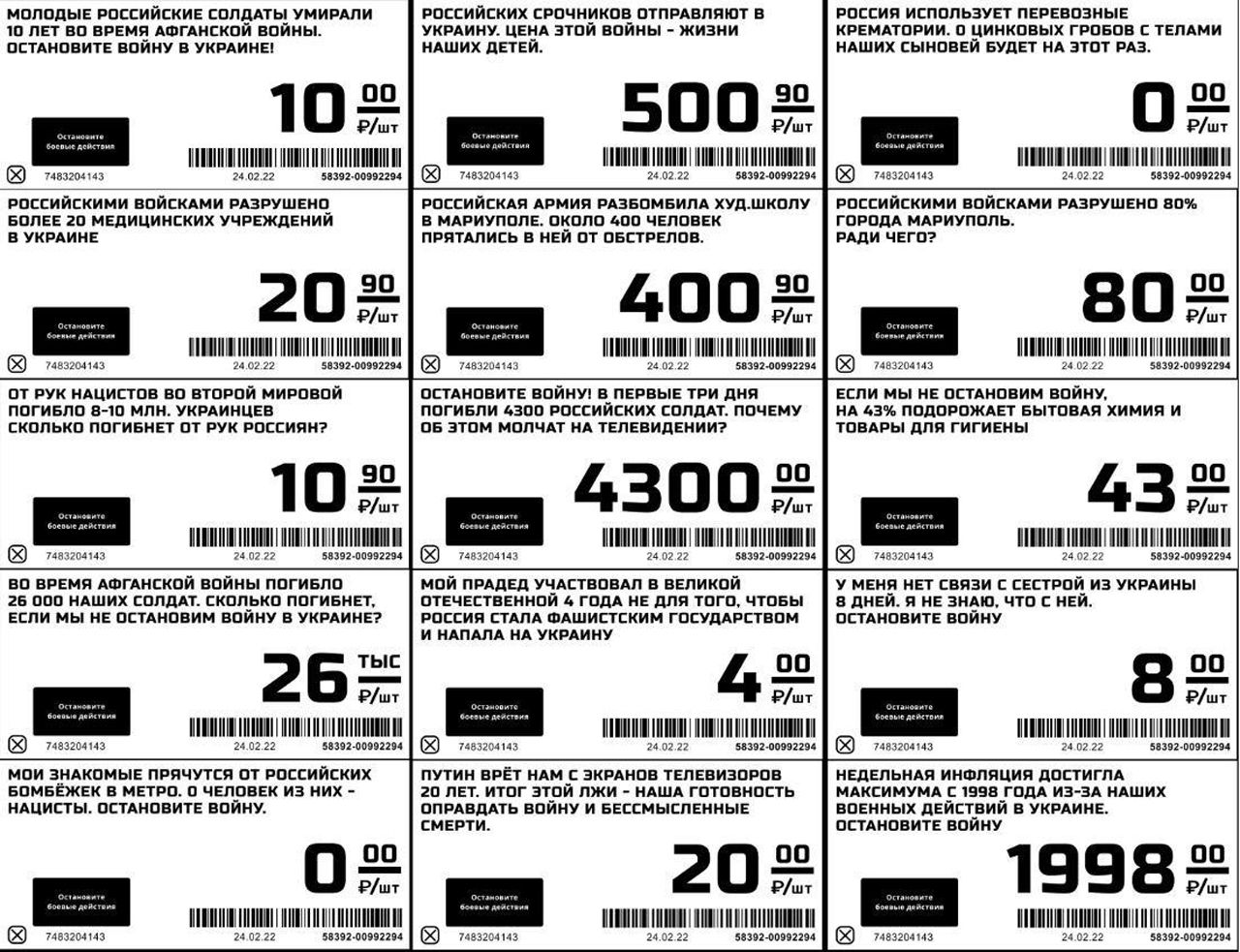 — Сегодня антивоенные ценники — это одна из распространенных форм протеста, наравне с расклейкой стикеров и листовок в общественных местах, — говорят в движении. — Увы, ни одна из форм антивоенного протеста в России сегодня не является стопроцентно безопасной. Мы считаем важным регулярно подчеркивать это и призываем всех уделять особое внимание правилам безопасности и не забывать про риски.