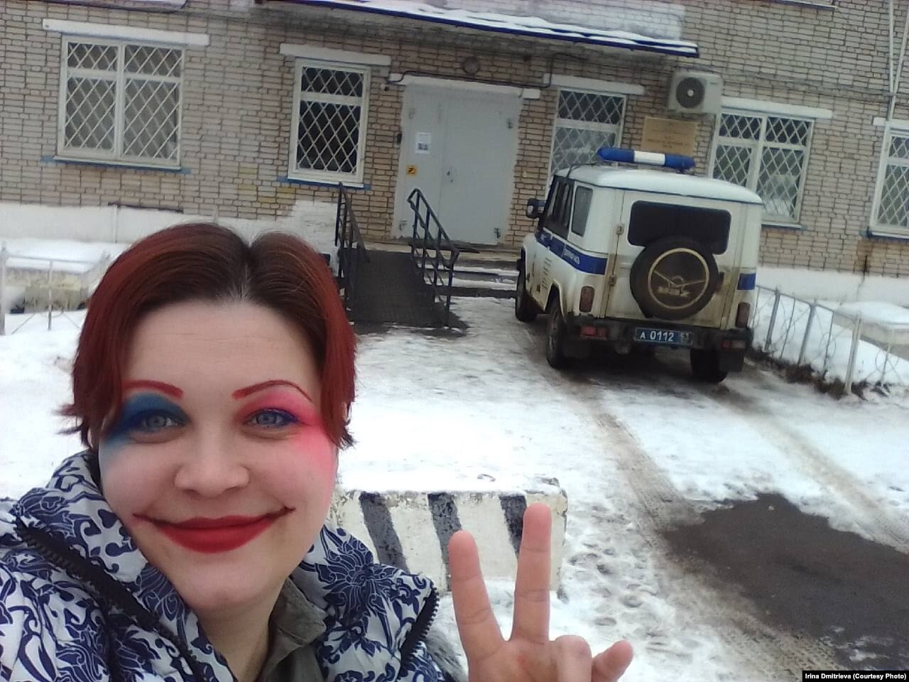 В 2021 году Ирина получила 20 часов обязательных работ за призыв выйти на январскую акцию протеста в поддержку Навального. Тогда она приехала из Новой Деревни в Парфино и подошла к зданию районной администрации в образе Джокера. Суд оставил Дмитриеву на свободе, так как у неё четверо детей.