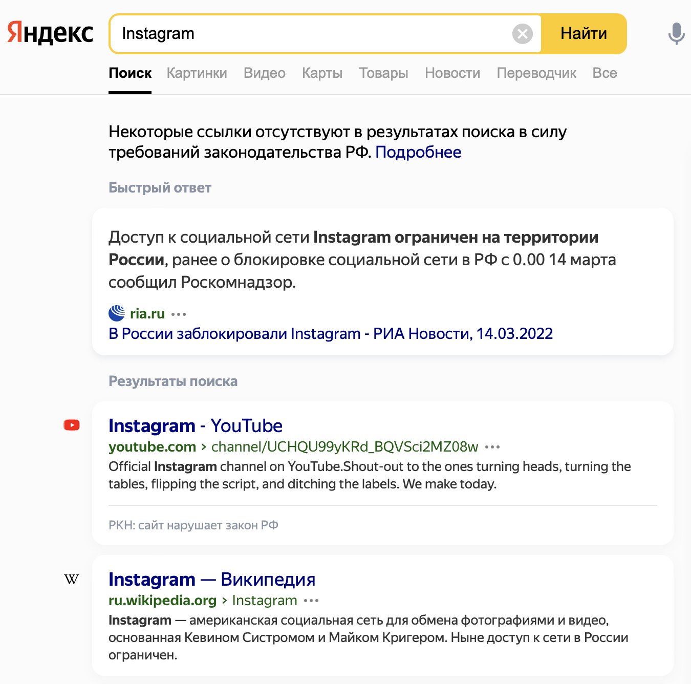 «Яндекс» и Mail.ru удалили из поисковой выдачи ссылки на Facebook и Instagram