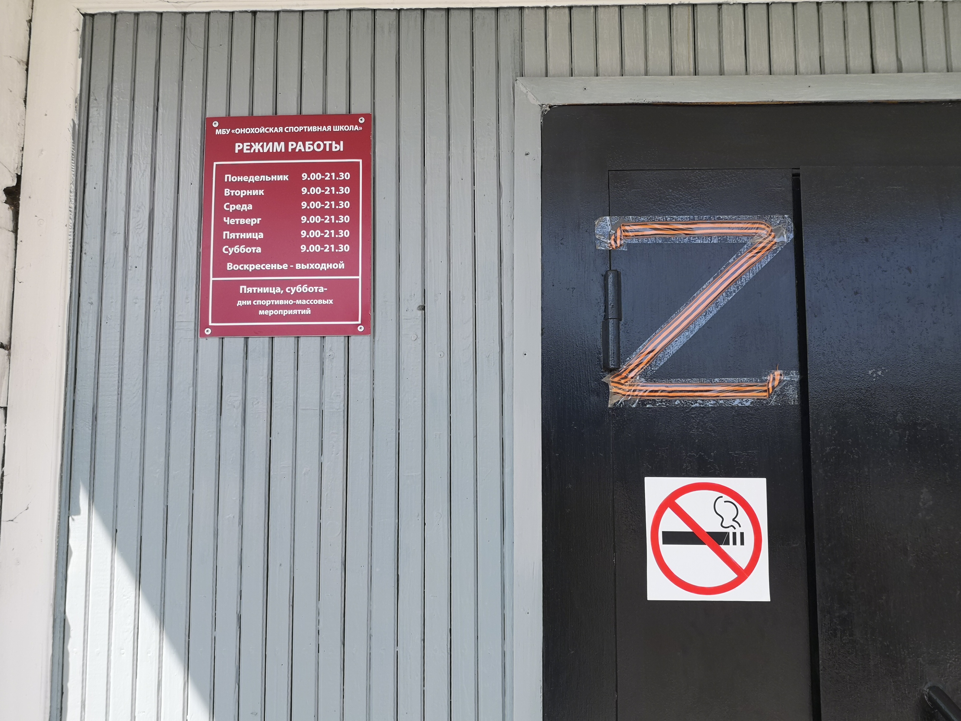23 марта в посёлке Онохой прошёл флешмоб "Zа наших". После этого на входе в детскую спортивную школу разместили латинскую букву Z. Увидев это, тренер Валерий Яковлев сорвал её. Но на следующий день буква появилась на двери вновь.