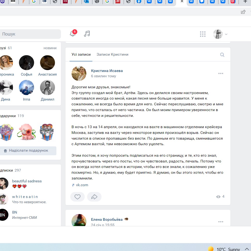 Информация о погибших моряках крейсера «Москва» в сети Вконтакте, похоже, действительно долго не живет. Утром 18 апреля жительница Краснодара Кристина Исаева опубликовала в группе Music Track Experts запись о том, что создатель группы, ее брат Артем Мишустин, погиб на крейсере «Москва». «В ночь с 13 на 14 апреля, он находился на вахте в машинном отделении крейсера Москва, заступив на вахту, через некоторое время произошел взрыв. Сейчас он числится в списке пропавших без вести. По данным его товарища, сменившегося с Артемом вахтой, там невозможно было уцелеть», – написала Исаева.
