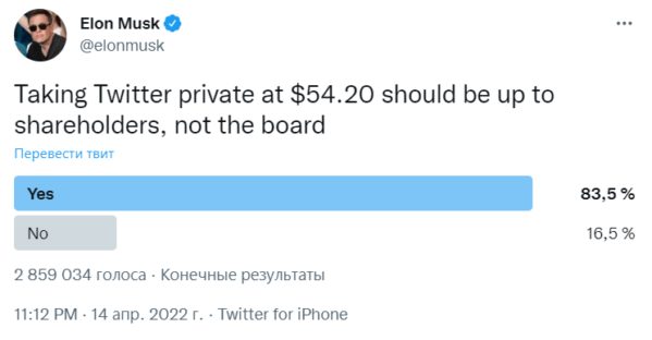 Ещё через несколько дней стало понятно, почему Маск передумал вступать в совет директоров: он объявил, что намерен приобрести компанию целиком. На позиции одного из членов совета он мог владеть не более, чем 15% акций, но предпринимателю этого оказалось мало. Он предложил купить соцсеть за 43 миллиарда долларов — по 54,2 доллара за акцию.