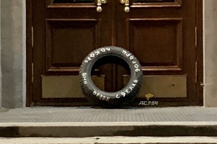 На крыльце мэрии Новосибирска появилась покрышка с надписью о качестве дорог. Там же упоминается глава города.