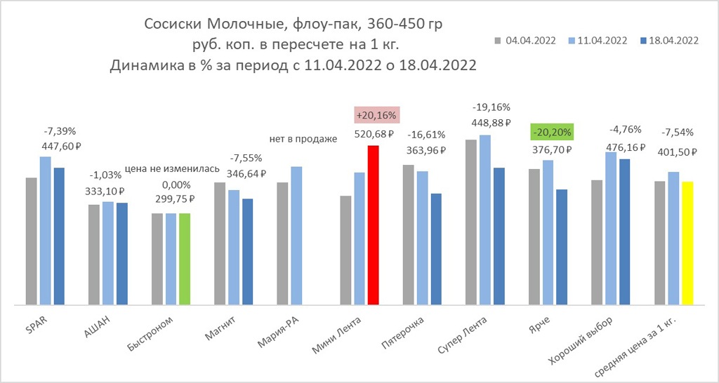 Не смотря на то, что в основной массе торговых точек отмечалось снижение цены на молочные сосиски, в «Мини Ленте» самая дешевая позиция подорожала на 20%.