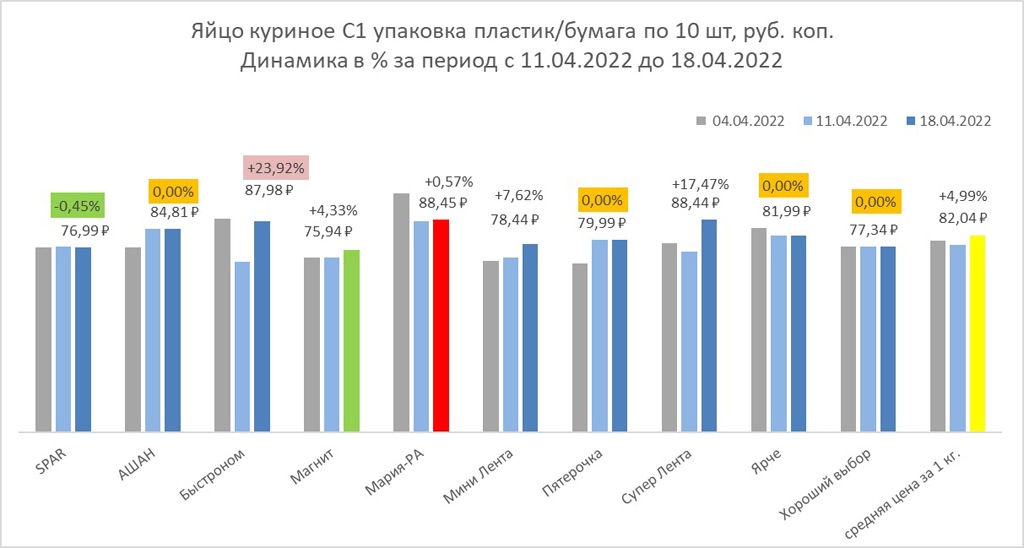 Куриные яйца в среднем подорожали почти на 5%, в «Быстрономе» товар был дороже почти на четверть, в четырех торговых точках стоимость продукта не изменилась.