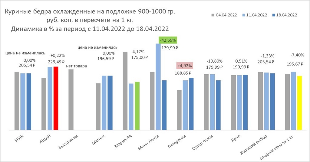 Куриные бедра в основном подешевели, в «Мини Ленте» удалось найти товар дешевле почти в полтора раза, чем неделей ранее.