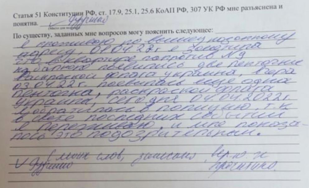 - Донос на него написала соседка, акушерка Елена Рутченко. В своем объяснении (есть в распоряжении «Проекта») Рутченко пишет, что 1 апреля она заметила в квартире напротив на балконе ленточки «раскраской флага Украины». 4 апреля она обратилась в полицию, так как «в свете последних событий» ей это показалось подозрительным.