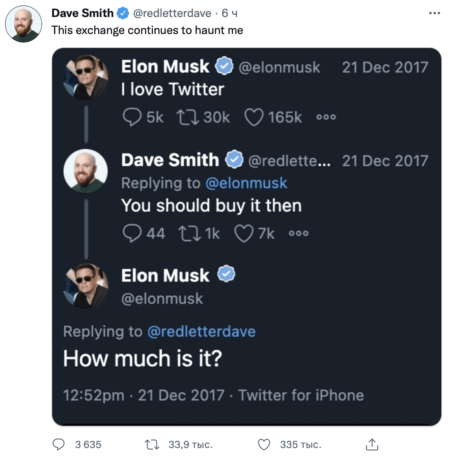 25 апреля Twitter объявил, что владельцем соцсети станет Илон Маск — он купит её за 44 миллиарда долларов. Маск заявил, что собирается сделать платформу «лучше, чем когда-либо»: добавить новые функции, сделать исходный код открытым и аутентифицировать всех людей.