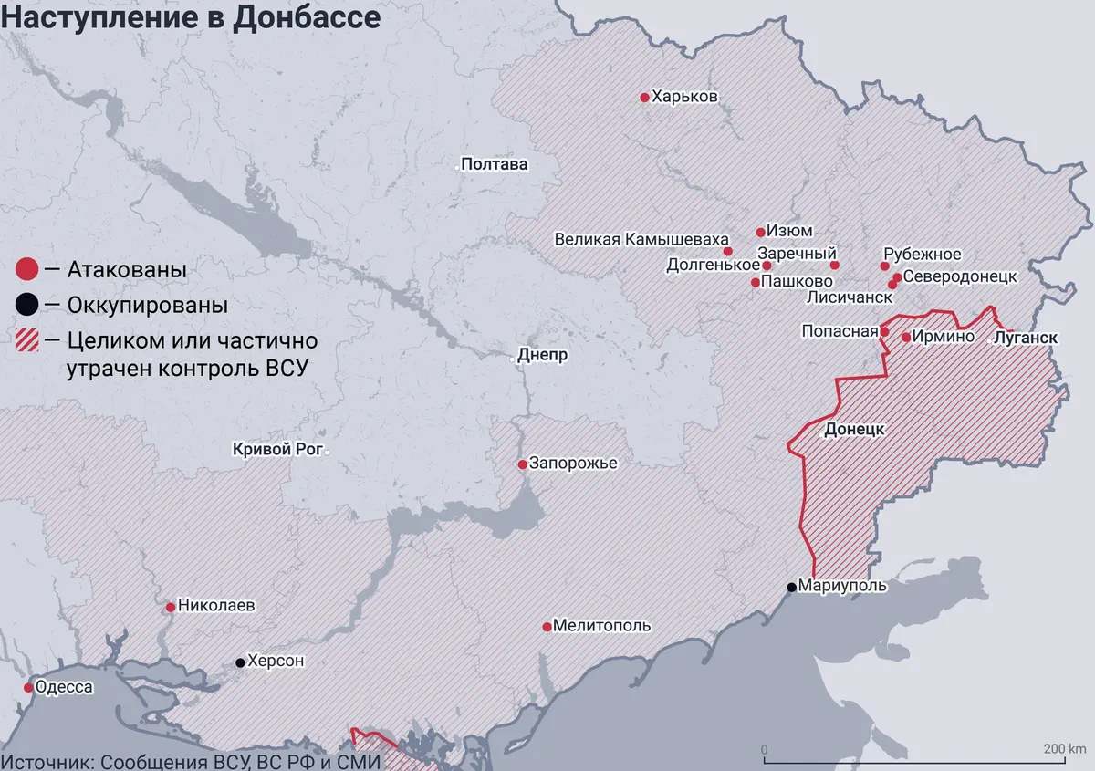 От Изюма пытаются продвинуться и на запад, и на юго-запад по направлению к Днепру. Это не слишком интенсивное наступление. Другое направление — в сторону Лимана. Предполагается, что эти войска могут где-то в перспективе соединиться с группировками российских войск, которые пытаются овладеть районом Рубежное- Северодонецк-Лисичанск. Видимо, чтобы отрезать группировку Вооруженных сил Украины, и, возможно, соединиться с теми российскими войсками, которые сейчас ведут бои за Попасную к югу от Лисичанска.