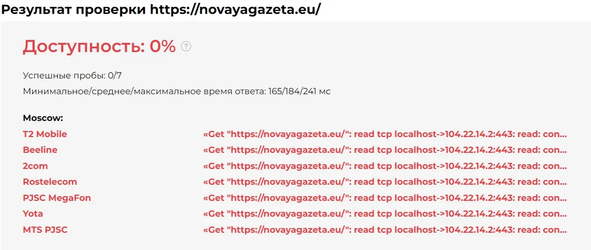 Согласно порталу, доступность сайта — 0%. Редакция не получала никаких предупреждений и писем от Роскомнадзора. Возможно, сайт могли заблокировать.