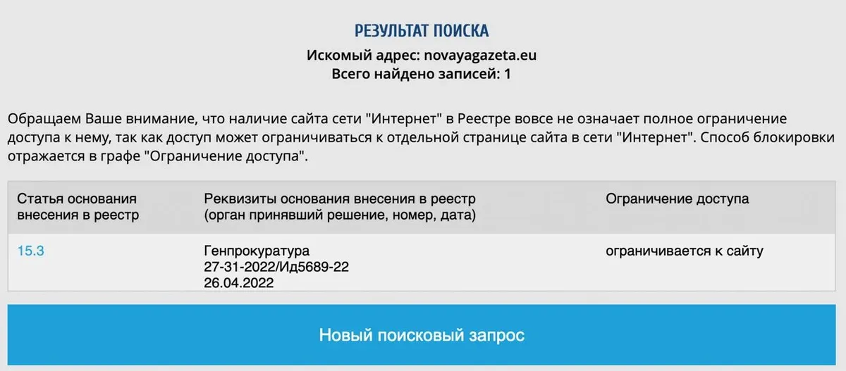Роскомнадзор заблокировал сайт «Новой газеты. Европа» по требованию Генпрокуратуры от 26 апреля, следует из данных РКН.