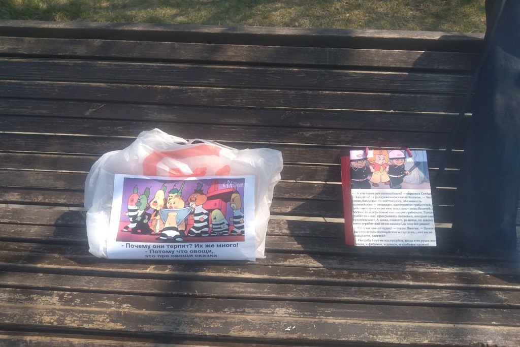 15:47 На площади Ленина в центре Новосибирска выставили пакеты с цитатами из книг «Приключения Чиполлино» и «Незнайка на Луне», передает тг-канал «Гражданские репортеры Сибири».
