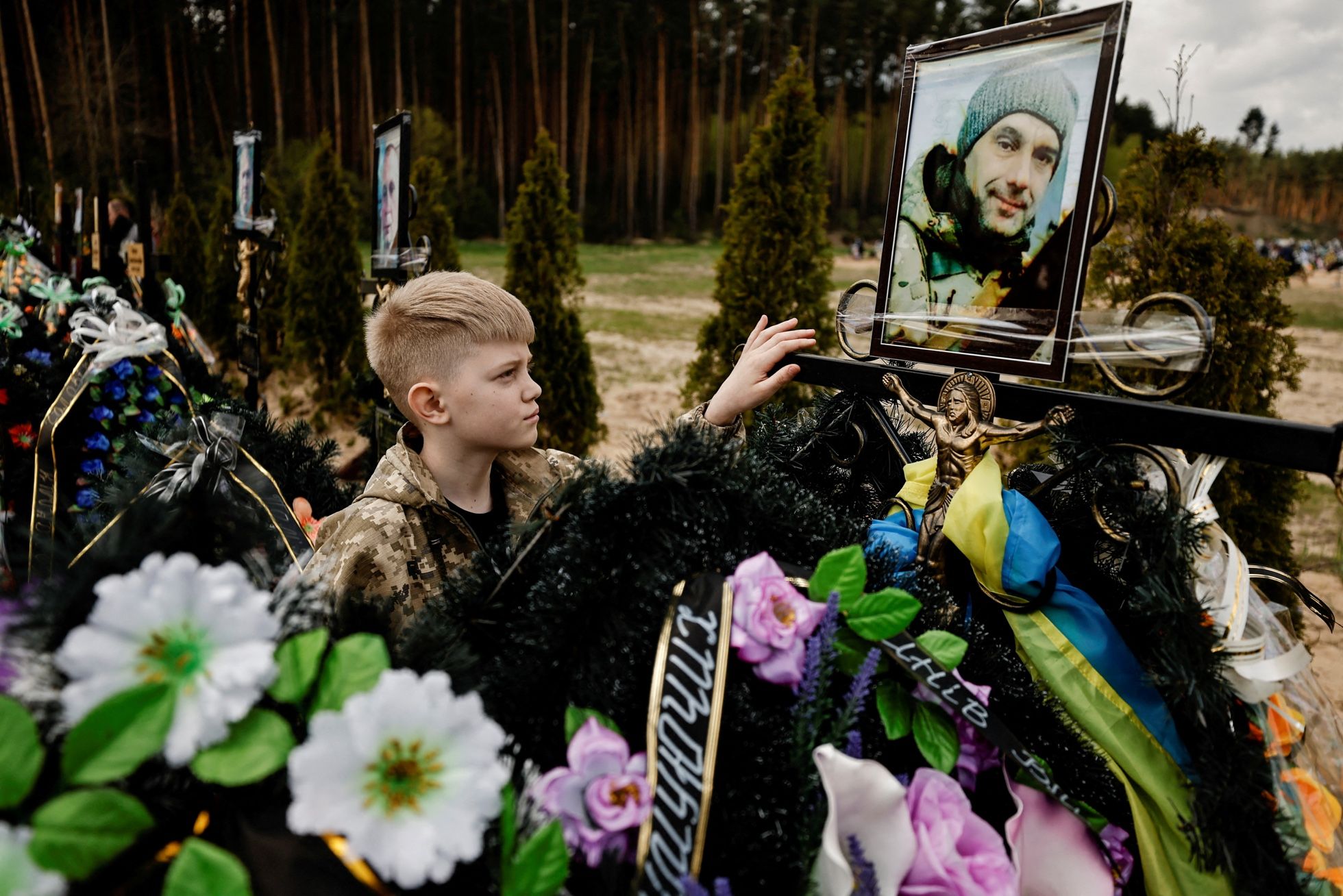 10-летний Савелий на могиле отца — 47-летнего Игоря Кротких, который, по словам жены, погиб при обстреле