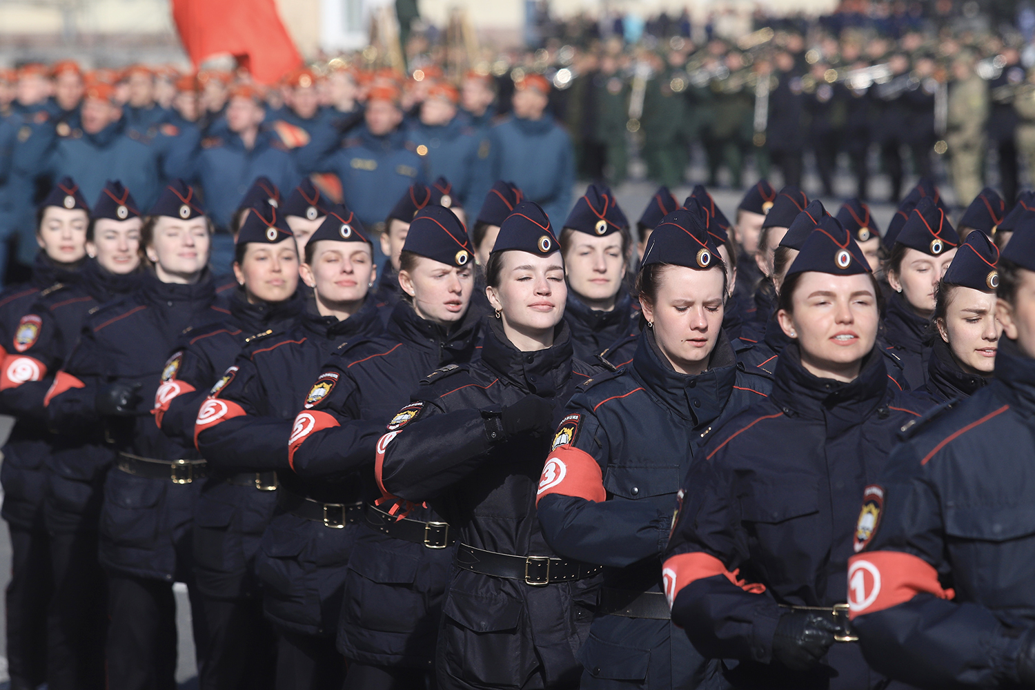 1 мая телеграм-канал NEXTA Live опубликовал фотографии с репетиции парада Победы на Дворцовой площади. На них участницы носят красные нарукавники с черными цифрами. Пользователи сравнивают повязки с теми, что носили в Третьем рейхе.