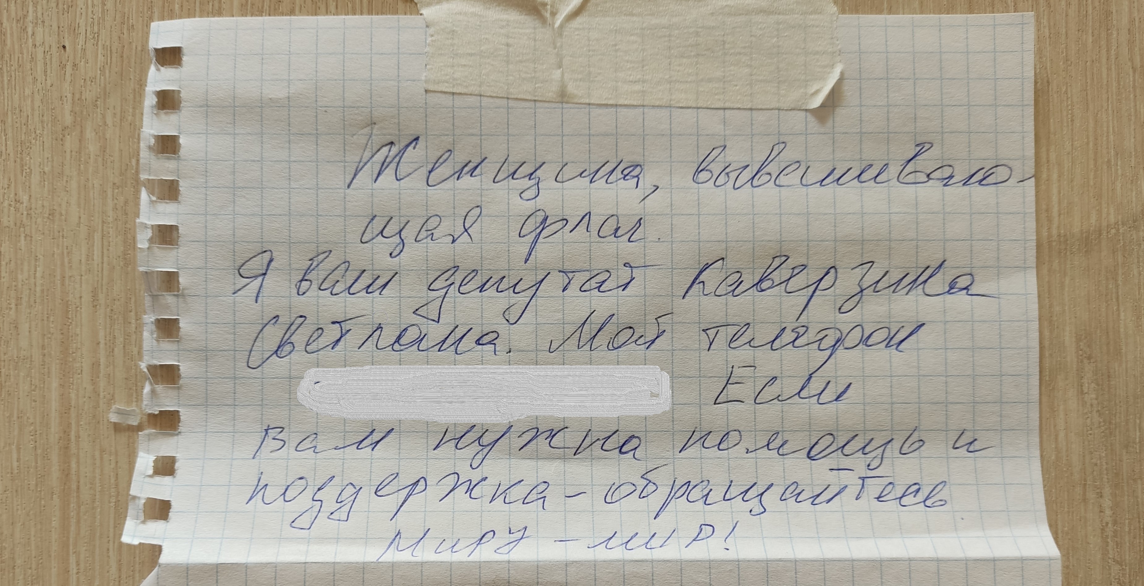 – У меня на тот момент было ощущение, что в такой ситуации человек вроде меня остается один на один с "телевизором" и вообще не знает, то ли он сошел с ума, то ли мир? Я вывесила флаг, чтобы кто-то вроде меня получил сигнал – он не один. Впрочем, сейчас я уже много таких сигналов получила. Возвращаюсь как-то домой, а на дверях приколота записка от моего депутата Светланы Каверзиной. Я так обрадовалась и так была благодарна за слова поддержки! У нее самой неприятности, у ее помощников был обыск. И все же она потратила время, чтобы отыскать мою квартиру и выразить поддержку. И еще приятно, что она мой депутат в горсовете. Это редкий случай за последние 15 лет, когда я нашла, за кого проголосовать.