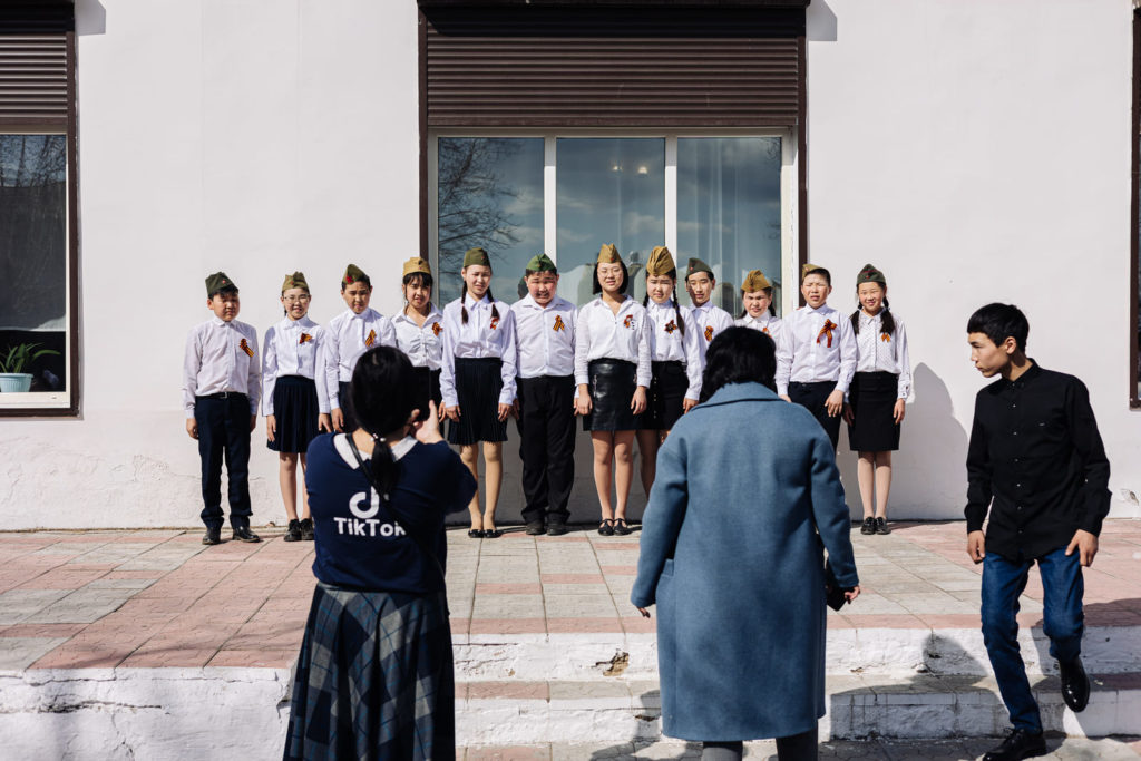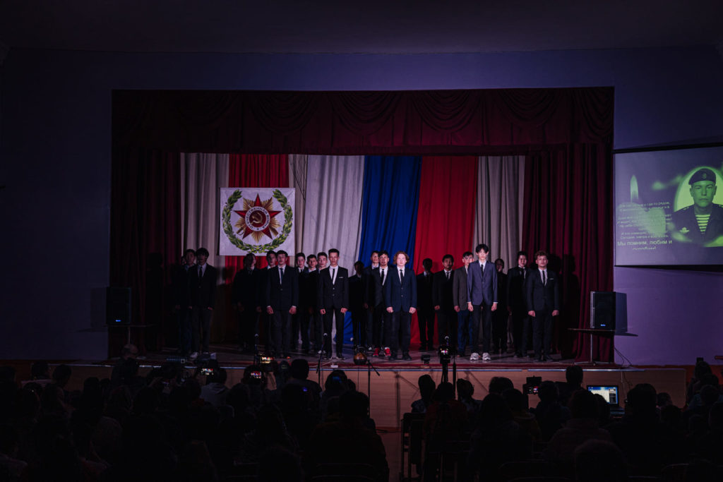 12-летняя Марина выступает одной из первых. Буква Z, сделанная из георгиевской ленточки, ярко выделяется на её рубашке. На Марину из зрительного зала в упор смотрит девочка, одетая почти так же. Только ленточка прикреплена традиционным способом — крест-накрест. «Говорила же тебе, надо было „зэты“ делать», — громким шёпотом говорит девочка своей подруге.