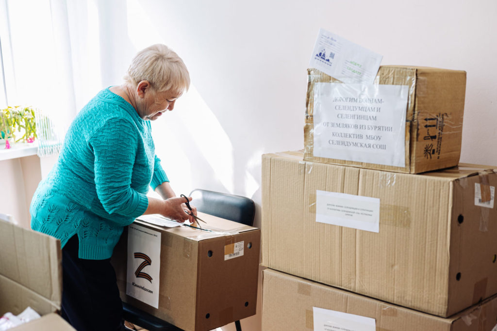 Посылки для солдат в Селендуме собирает ведущий специалист сельской администрации Ольга Дунаева. Ольга заводит журналистов в кабинет, в котором десятки картонных коробок стоят на столах, стульях и полу. Все они заклеены листами с буквой Z. На одной из коробок — надпись «водка студёная». Коробка стоит под российским гербом.