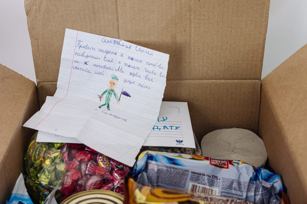 «Смотрите, что люди влаживают», — Ольга вынимает из одной коробки листок из школьной прописи, на котором — детские рваные буквы. Автор — восьмилетний мальчик Серёжа. «Привет солдат я желаю чтобы вы победили, — пишет Серёжа. — Ещё я желаю, чтобы вы не погибли. Мы ждём вас спасибо мой дядя там». На листке нарисован солдат, который держит чёрный флаг и что-то похожее на пистолет.