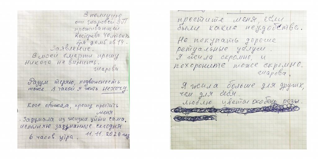 Ниже было дописано: «Разум теряю, подвижность тоже. А такой я жить не хочу. Кого обижала, прошу простить меня. Задумала из жизни уйти сама. Исполняю задуманное сегодня 11.11.2020 год. 6 часов утра».