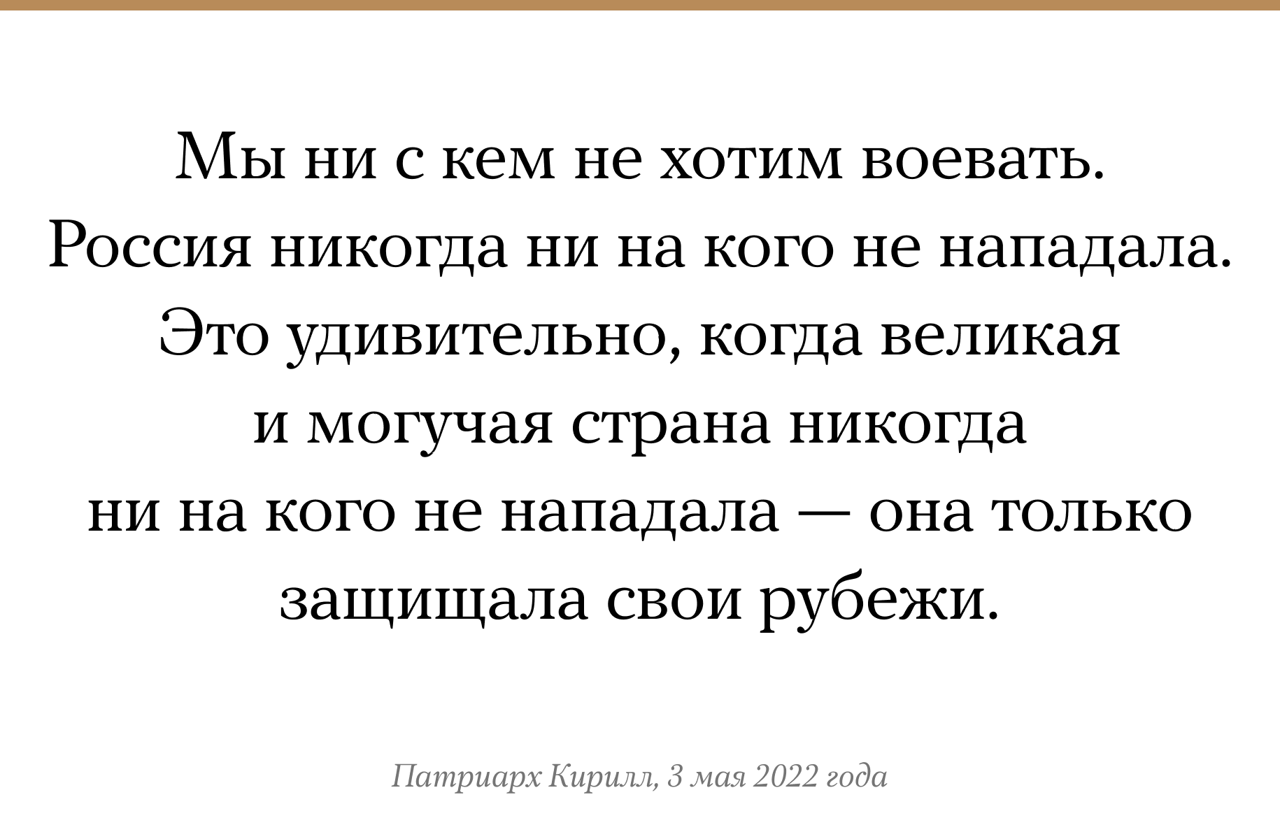 Патриарх Кирилл совершил 3 мая божественную литургию в Архангельском соборе Московского Кремля. В ходе проповеди он заявил, что Россия никогда ни на кого не нападала. Он добавил, что церковь будет молиться, чтобы границы России оставались неприступными от нашествия «иноплеменников», а россиянам хватило силы и чести эти границы защитить. РПЦ прямо не высказывала свою позицию о войне в Украине, однако патриарх Кирилл частоупоминаетвоенные действия в своих проповедях. Российские власти называют вторжение в Украину «специальной военной операцией» по «денацификации» и «демилитаризации» страны. Глава МИД РФ Сергей Лавров в марте утверждал, что Россия не нападала на Украину.