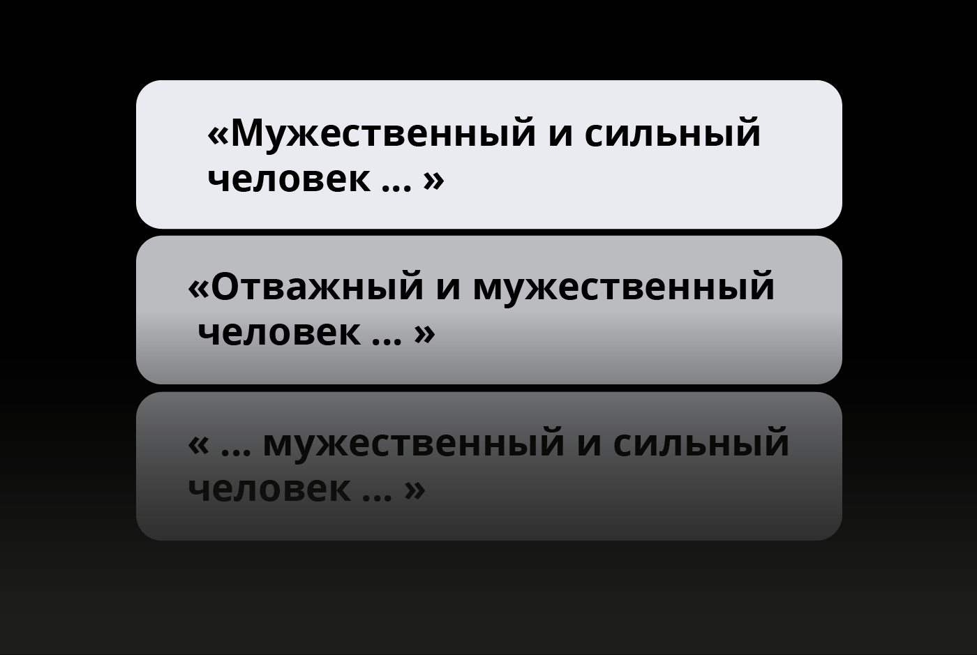 • Четыре соболезнования губернатора из девяти начинаются со слов «мужественный, сильный человек». Еще в одном соболезновании это же словосочетание начинает второе предложение в прямой речи Беглова. Похожее словосочетание «отважный и мужественный человек» встречается в еще одном пресс-релизе.