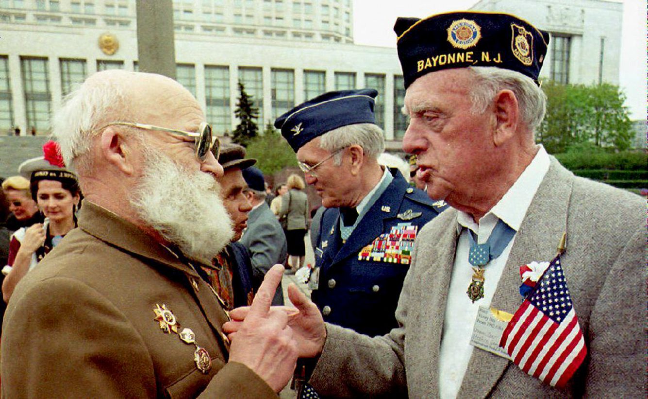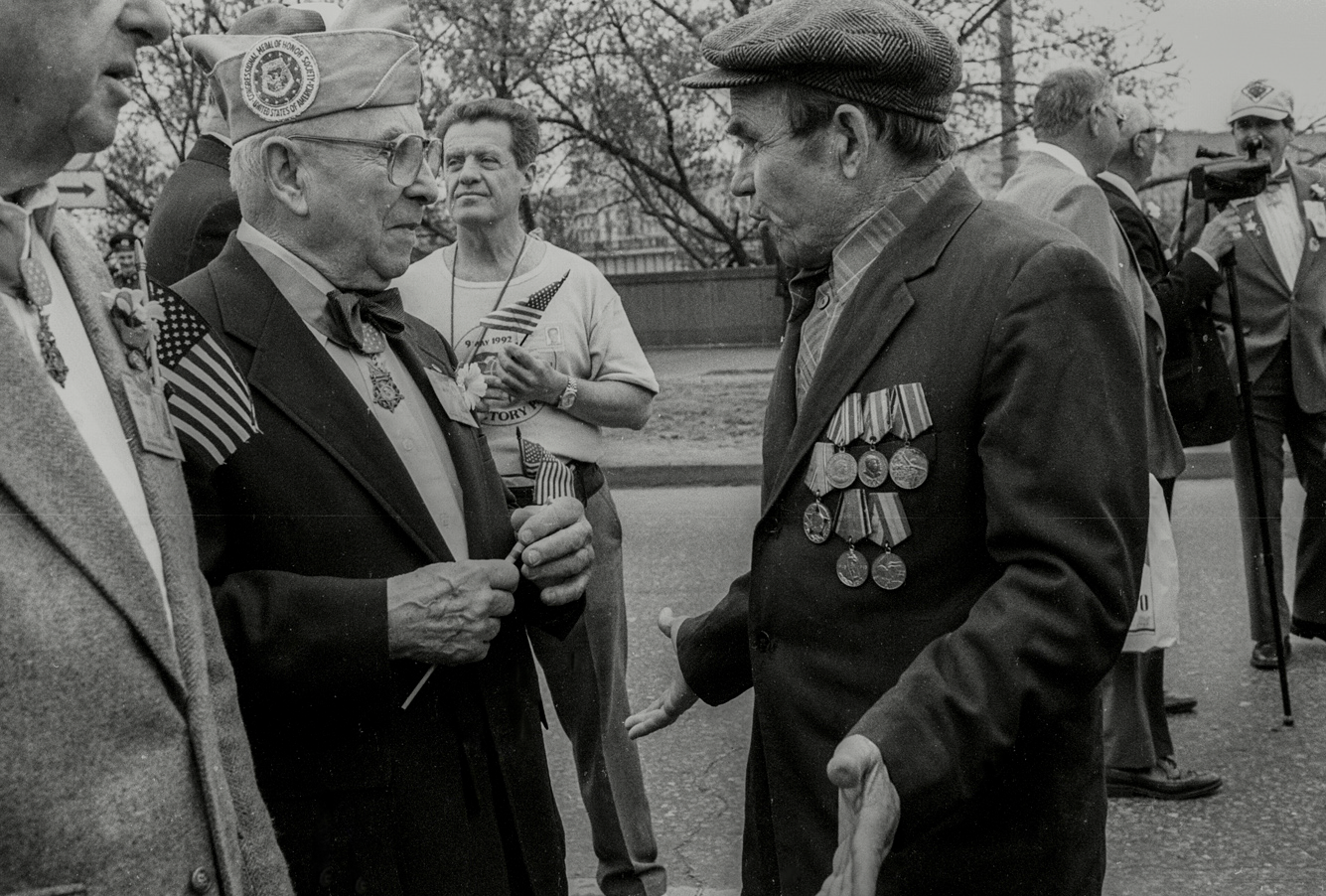 Сергей Мамонтов, Александр Неменов / ТАСС В параде участвовали знаменосцы разных стран в форме времен Второй мировой войныВалерий Киселев / AFP / Scanpix / LETA Ветераны Второй мировой войны из России и Америки вспоминают военное прошлое, собравшись у Белого дома на площади Свободной РоссииОлег Булдаков / ТАСС Американский генерал Патрик Бредли и вице-президент России Александр Руцкой у посаженного ими платана имени Вашингтона. Дерево в знак дружбы и поддержки нового правительства России привезли из США и посадили на аллее напротив Дома СоветовДмитрий Борко На груди советского ветерана юбилейные награды за труд и победу в войнеДмитрий Борко С американской стороны на парад приехали ветераны, награжденные медалью Почета (высшей военной наградой США), командный оркестр резерва ВВС и оркестр волынокДмитрий Борко Бывший узник концентрационного лагеря с плакатом, обращенным к российскому правительству. Из-за тяжелой экономической ситуации многие пенсионеры остались без льгот и пенсийСергей Мамонтов, Александр Неменов / ТАСС Бывший народный депутат СССР Леонид Сухов возмущается участием в празднике иностранных артистов и военных. Девятого мая 1992 года кроме «Парада Мира» в Москве также прошла альтернативная акция коммунистов, которые критиковали президента Бориса Ельцина и требовали отпустить арестованных участников августовского путчаДмитрий Борко Участники колонны узников концентрационных лагерей нацистской Германии прошли по улицам в тюремных робахДмитрий Борко Впервые во время войны советские и американские военные встретились 25 апреля 1945 года на Эльбе. На параде «Победы Мира» 47 лет спустя ветераны из России общались с американцами и через журналистов передавали им поздравления на камеруДмитрий Борко Под оркестр и строевые песни разных стран колонна ветеранов прошла от Белого дома по Новому Арбату и вышла к стенам КремляРоберт Нетелев / ТАСС Марширующих ветеранов поддерживал оркестр из ГерманииДмитрий Борко «Кто бы мог поверить, что флаг Соединенных Штатов когда-либо пронесут на параде в Москве!» — удивлялся в репортаже CBS Radio американский корреспондент Кевин МакКарти. Американский флаг везде был рядом с новым российским триколором — в руках знаменосцев и на бортах автомобилейСергей Мамонтов, Александр Неменов / ТАСС Колонна бывших узников концлагерей. В руках у многих из них таблички с порядковыми номерами и названиями мест заключения