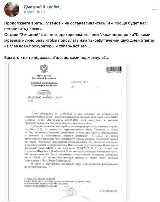 – Вы знакомы с Дмитрием Шкребцом? Это тот, кто первым написал о сыне, пропавшем при крушении крейсера. Вообще, общаетесь с солдатскими родителями?