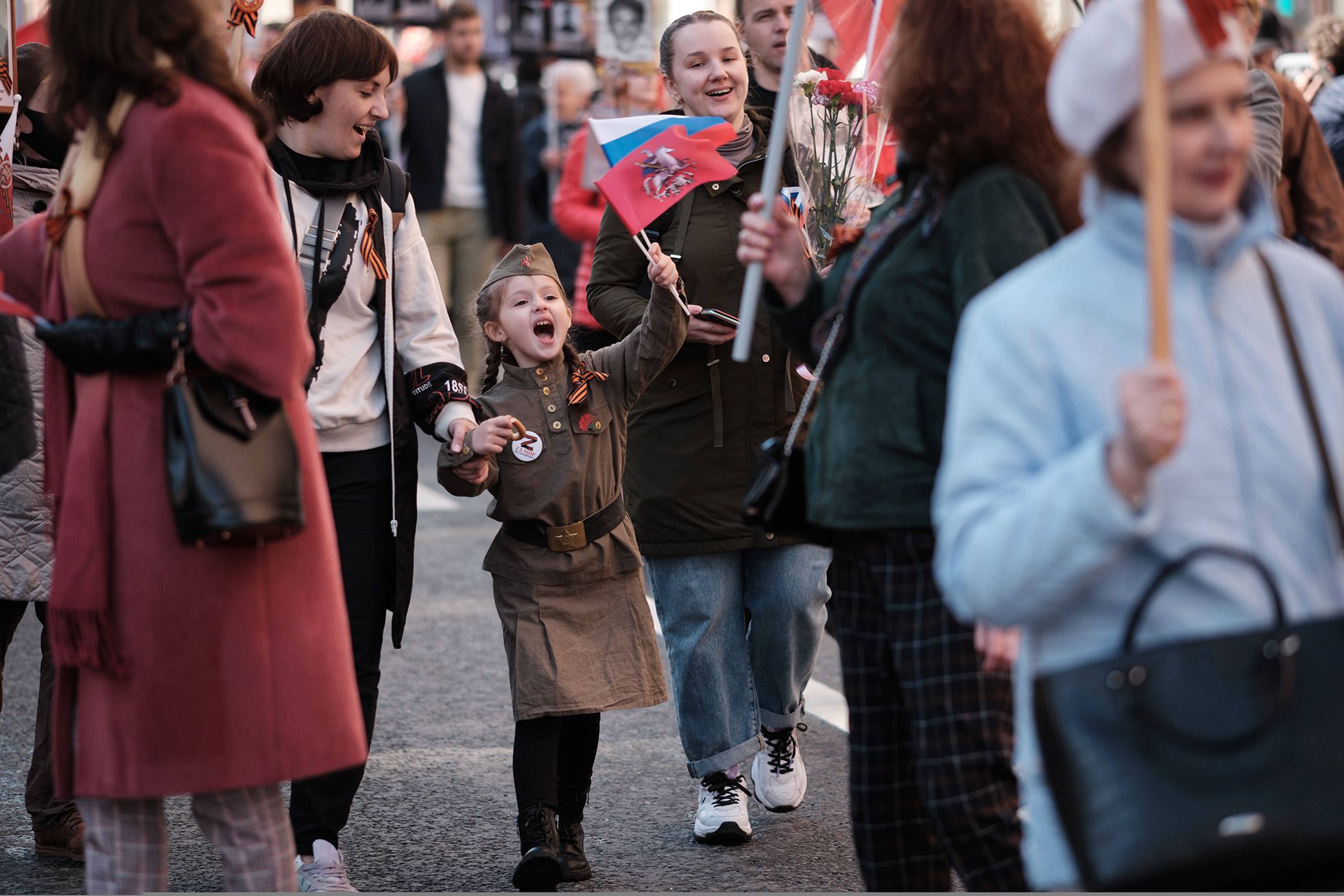 Среди других популярных на шествии символов — букв Z и V — выделялись белорусские и молдавские флаги. Двое мужчин, которые несли флаги Молдовы и СССР, объяснили мне, что они делают это «ради памяти». «А вот у вас почему георгиевской ленточки нет? Вы что, стыдитесь? Не надо стыдиться», — говорили они, уходя вперед полка.