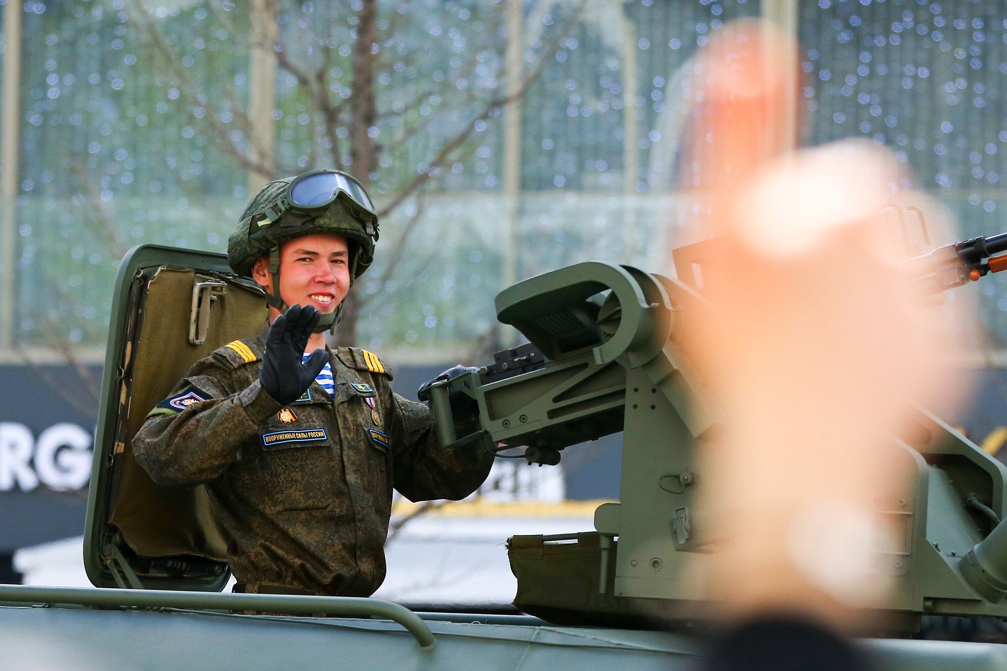 На протяжении всего парада он со знанием дела комментирует проезжающую мимо технику: «„Арматы“ пошли, мы их пока никому не продавали».