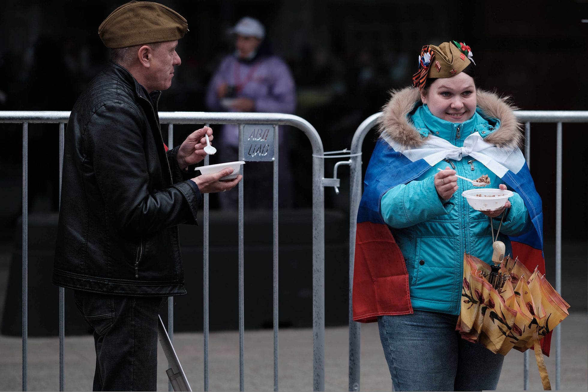 «Пап, мы сюда приперлись, чтобы ты посмотрел [парад]», — немного возмущенно говорит девушка с георгиевской ленточкой, прикрепленной к карману куртки, пожилому мужчине в очках и с биноклем на шее.