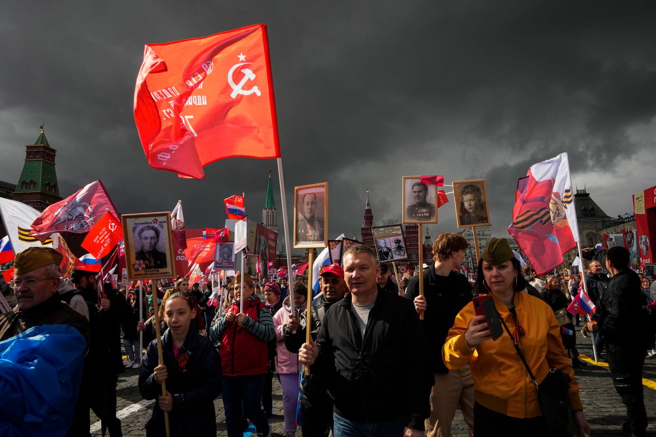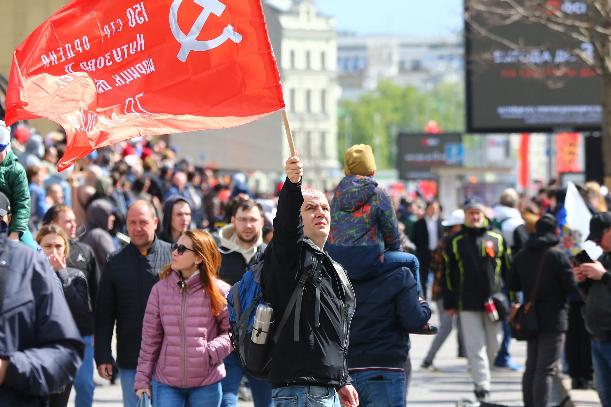 Того же нельзя было сказать об улицах Москвы. Уже в конце апреля в городе появились флаги «С днем Победы» и пластиковые инсталляции в виде цифры девять, а вместе с ними и советская символика — она встречалась чаще, чем в предыдущие годы. Источники «Медузы» в администрации президента называли такое украшение города частью кампании по присоединению украинских территорий.