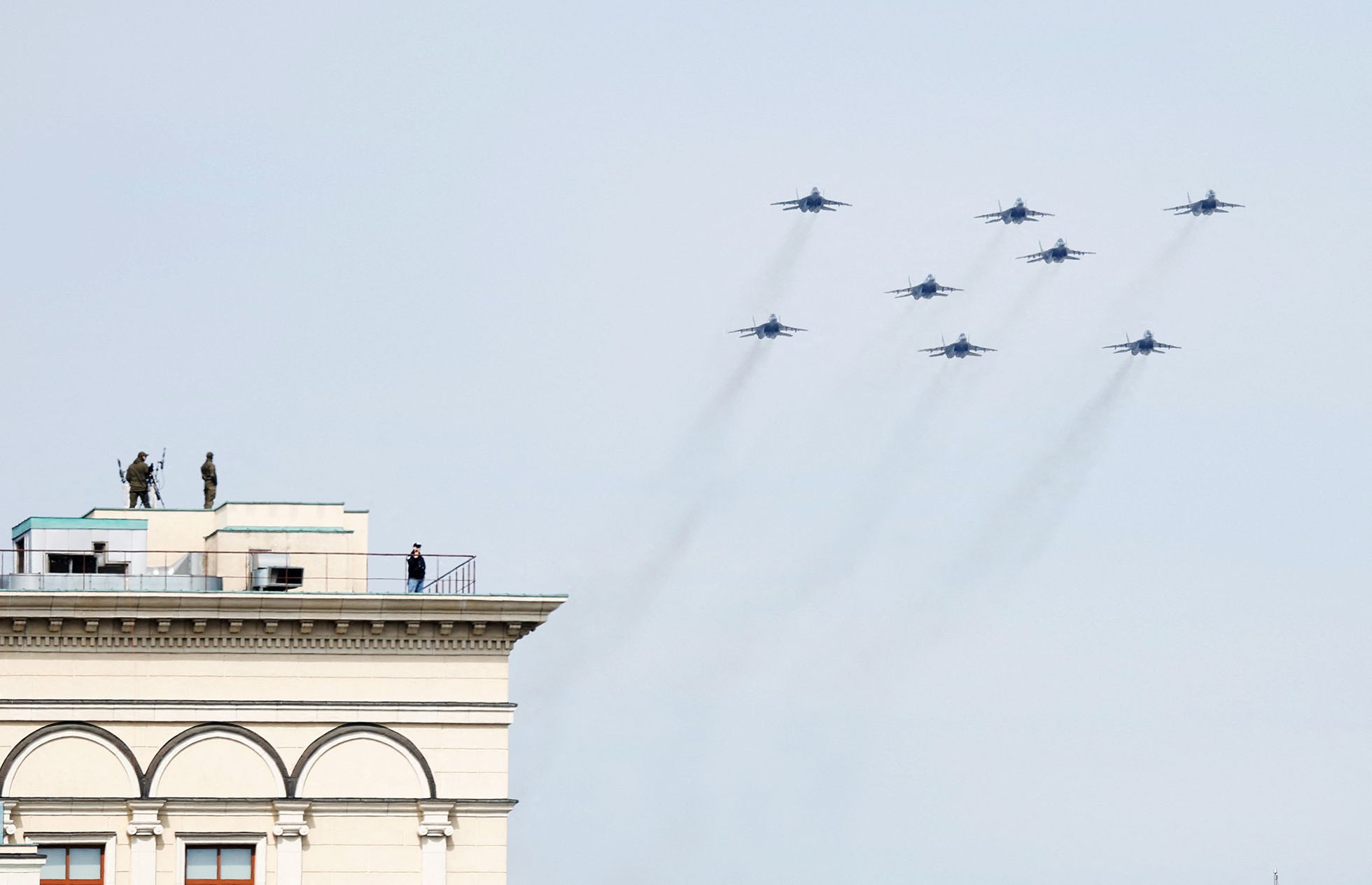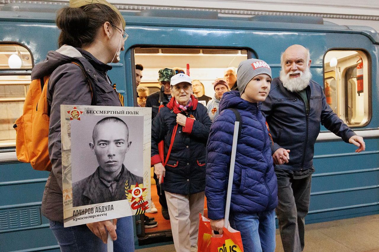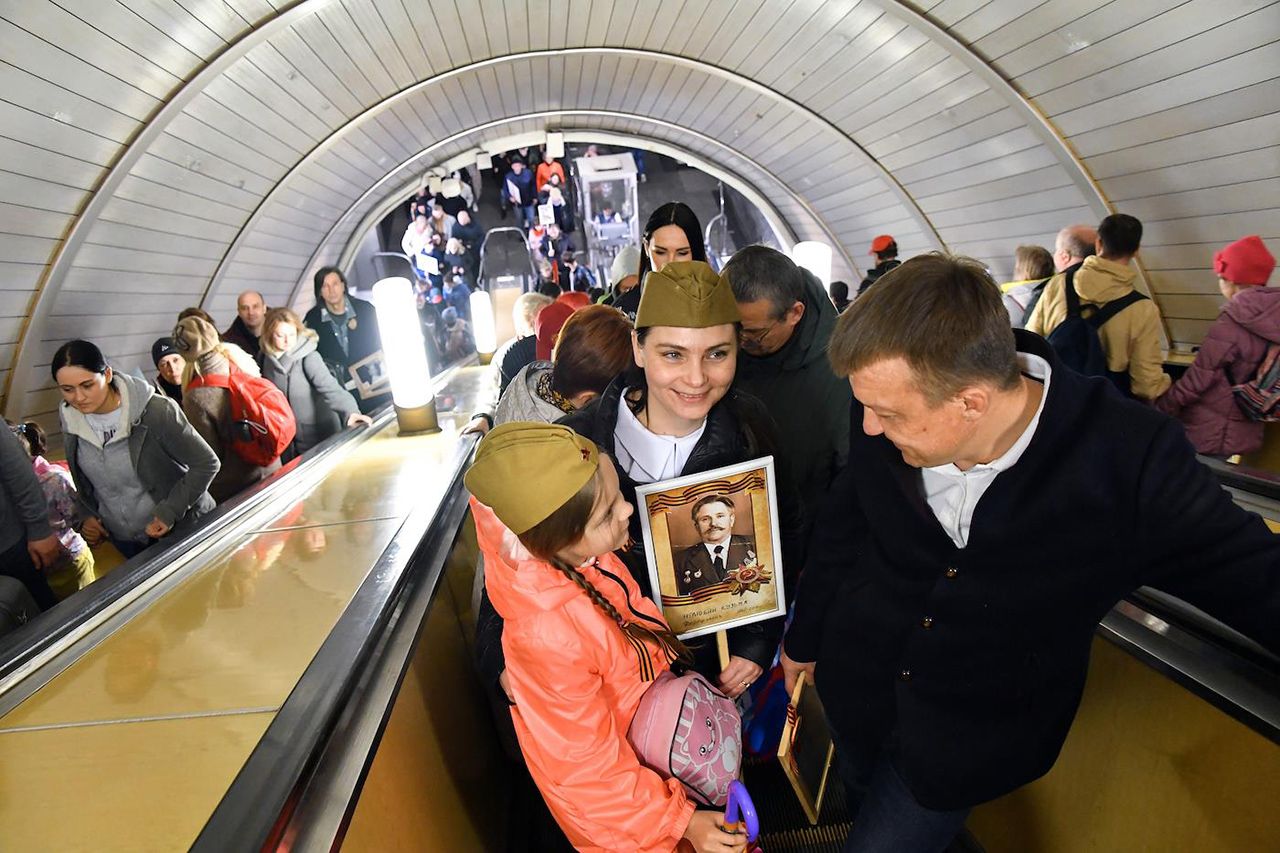 Накануне 9 мая в Москве было дождливо, но в Гидрометцентре заявили, что прогнозируемая высота облаков и «активное воздействие на погоду» с большой вероятностью позволят провести воздушную часть парада. В семь утра в столице действительно светило солнце. Вагоны метро выглядели полупустыми, из праздничного в подземке — только усиленные кордоны полиции с собаками. Единственный в вагоне по направлению к центру человек с георгиевской ленточкой — дремлющий полицейский. Даже плакаты в переходах напоминали о дне рождения метро, а не о Дне Победы.