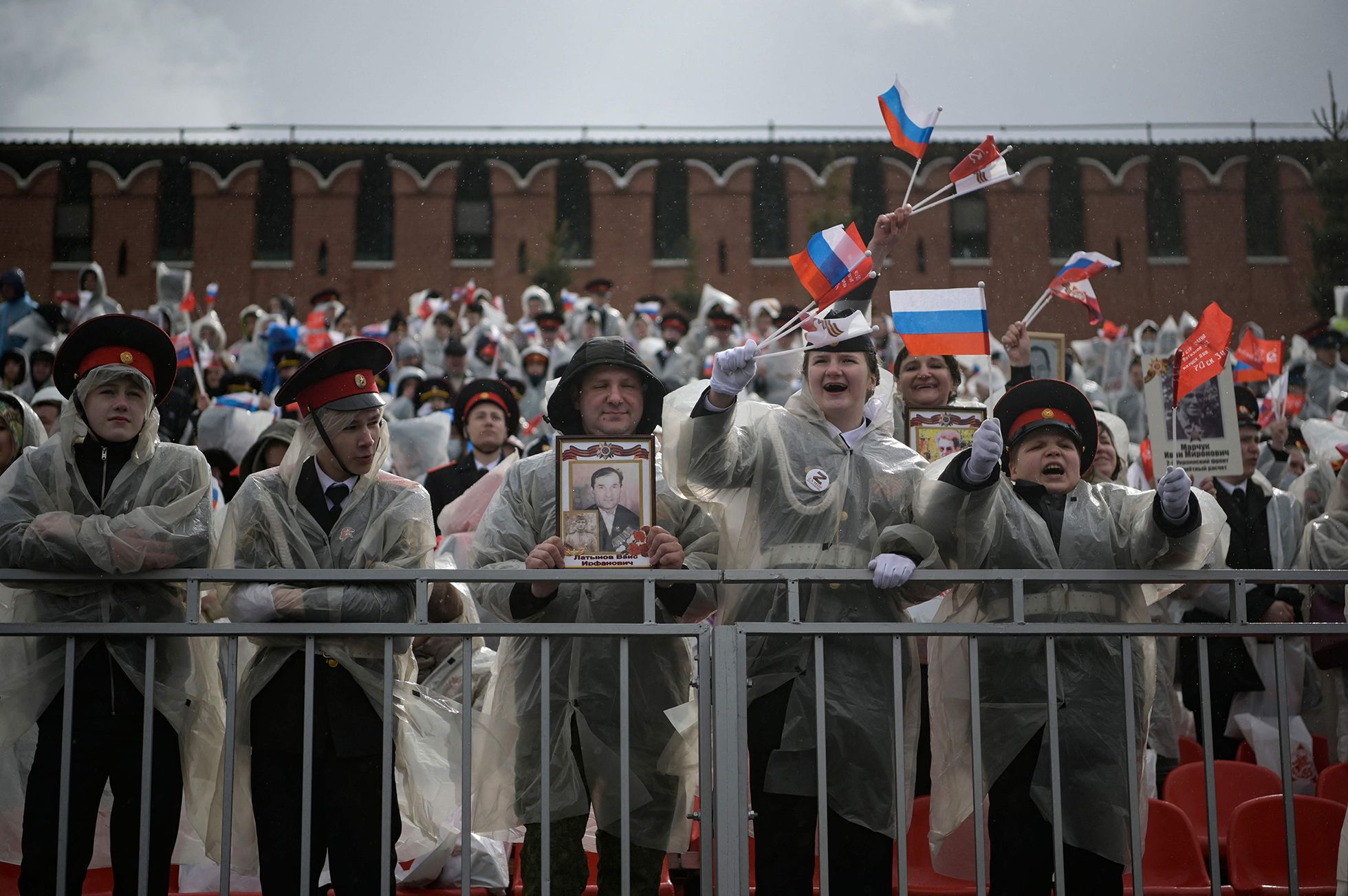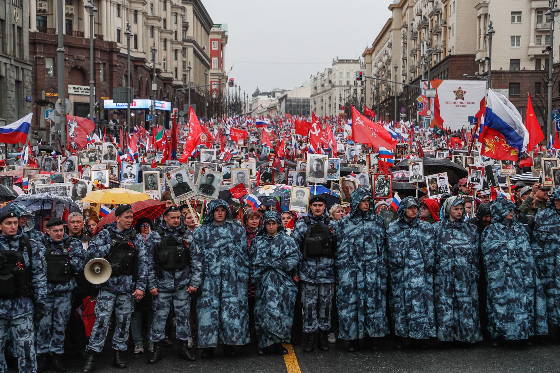 Красная площадь, даже после того как ее покинули высшие чины, закрыта — до тех пор пока в 15 часов по ней во главе «Бессмертного полка» не пройдет Владимир Путин. В центре усилены меры безопасности. «Откуда ментов столько на всю Москву набрали», — возмущается толпа.