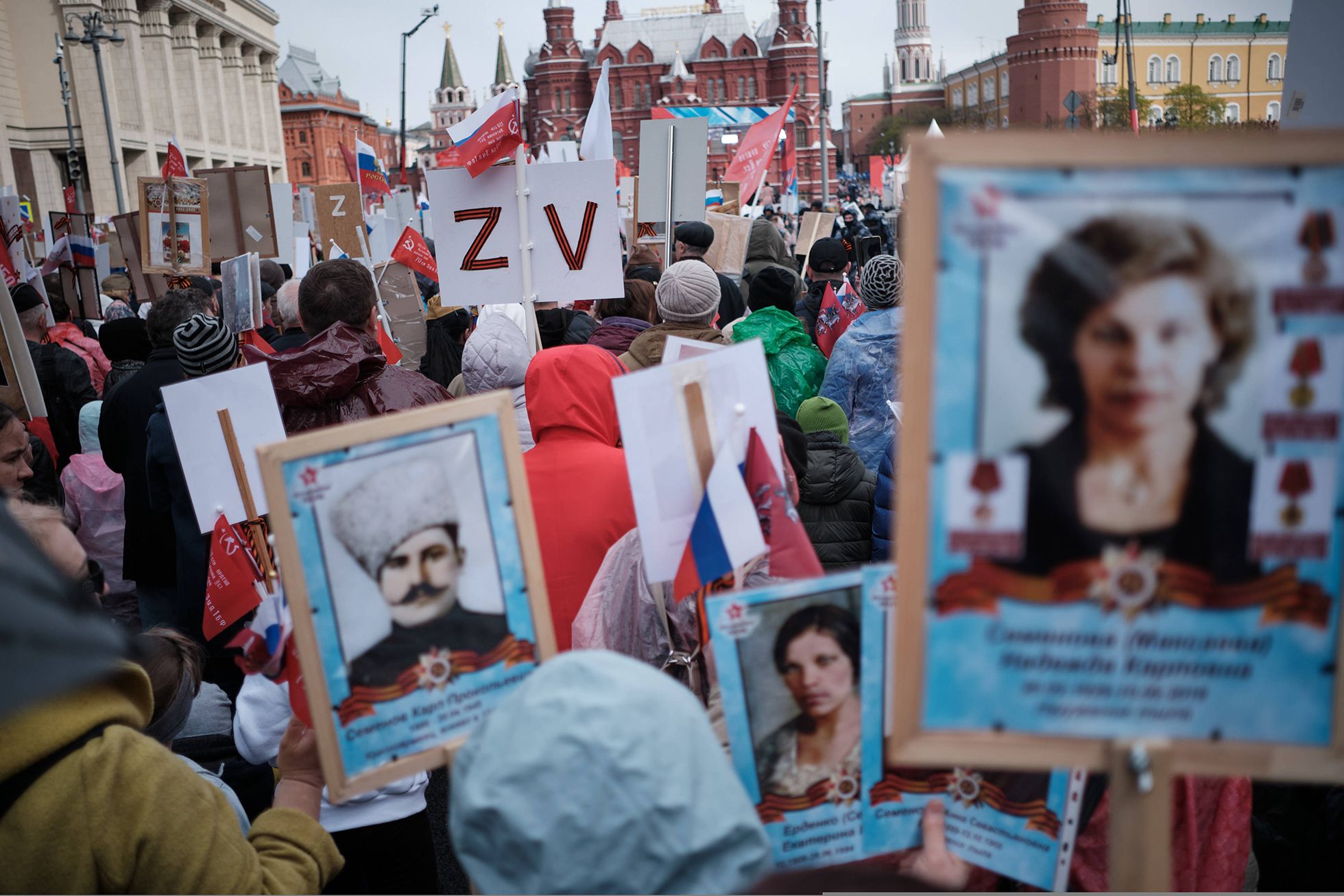 Были среди участвующих и те, кто нес портреты погибших в Украине российских солдат. Так, уже почти около Красной площади я встречаю женщину в темной закрытой одежде, которая несла две таблички, наложенные одна на другую. На передней части — фотографии родственников, участвовавших в Великой Отечественной войне. Женщина представилась Яной и рассказала, что ее семья из Харькова, на одной из фотографий изображен ее дед, а рядом с ним — его родные братья.