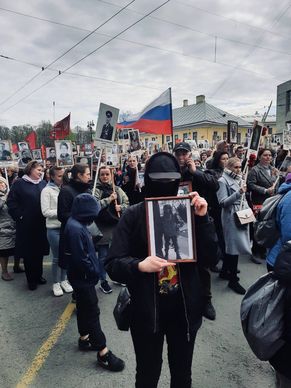 Некоторые вышли на «Бессмертный полк» с фотографиями российских солдат, погибших в Украине, а другие — со снимками убитых украинских военных.