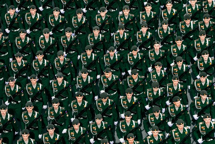 На парад в Петербурге пригласили ветеранов Великой Отечественной войны, блокадников и ветеранов военной службы. В строю прошли более 4100 военнослужащих, по Дворцовой проехали более 80 единиц военной техники во главе с танком Т-34. Как передавал MR7, некоторые молодые люди повязывали георгиевские ленты в форме букв Z и V, но большинство — традиционным бантиком.