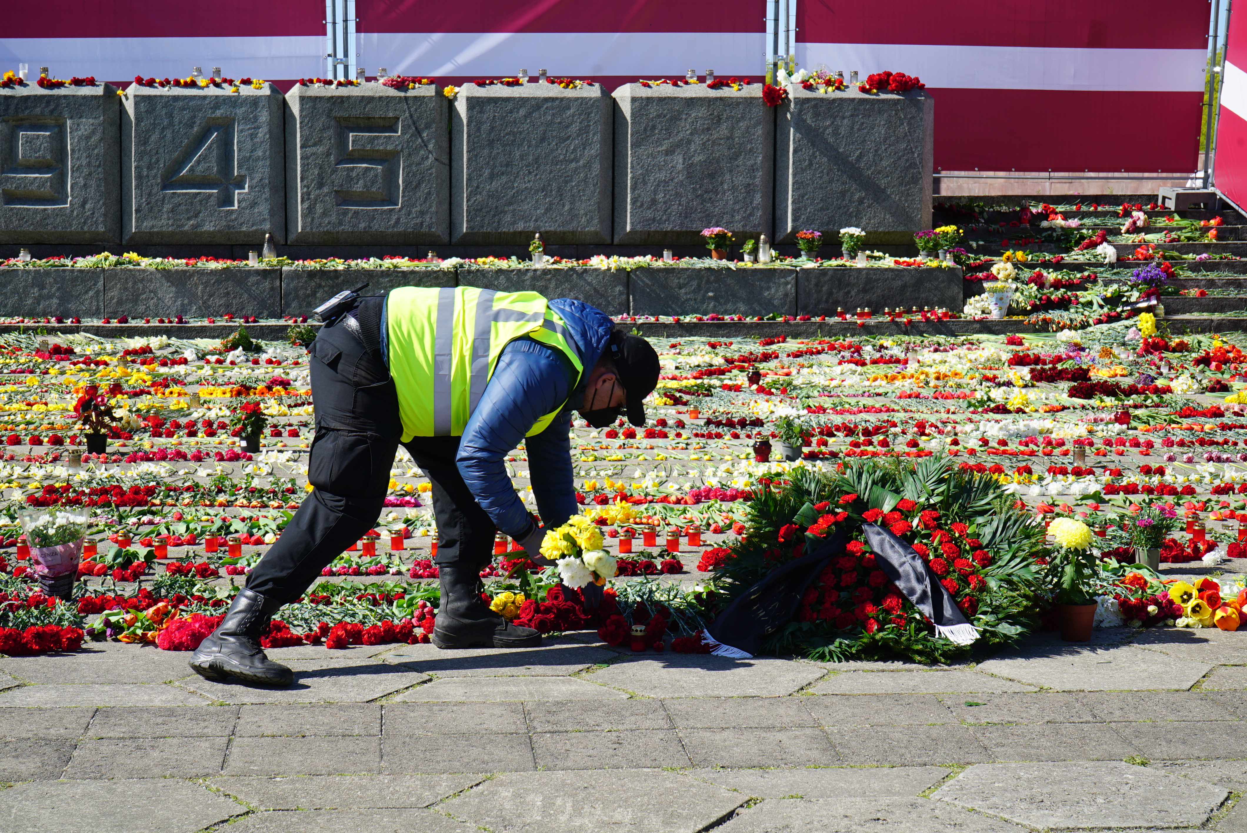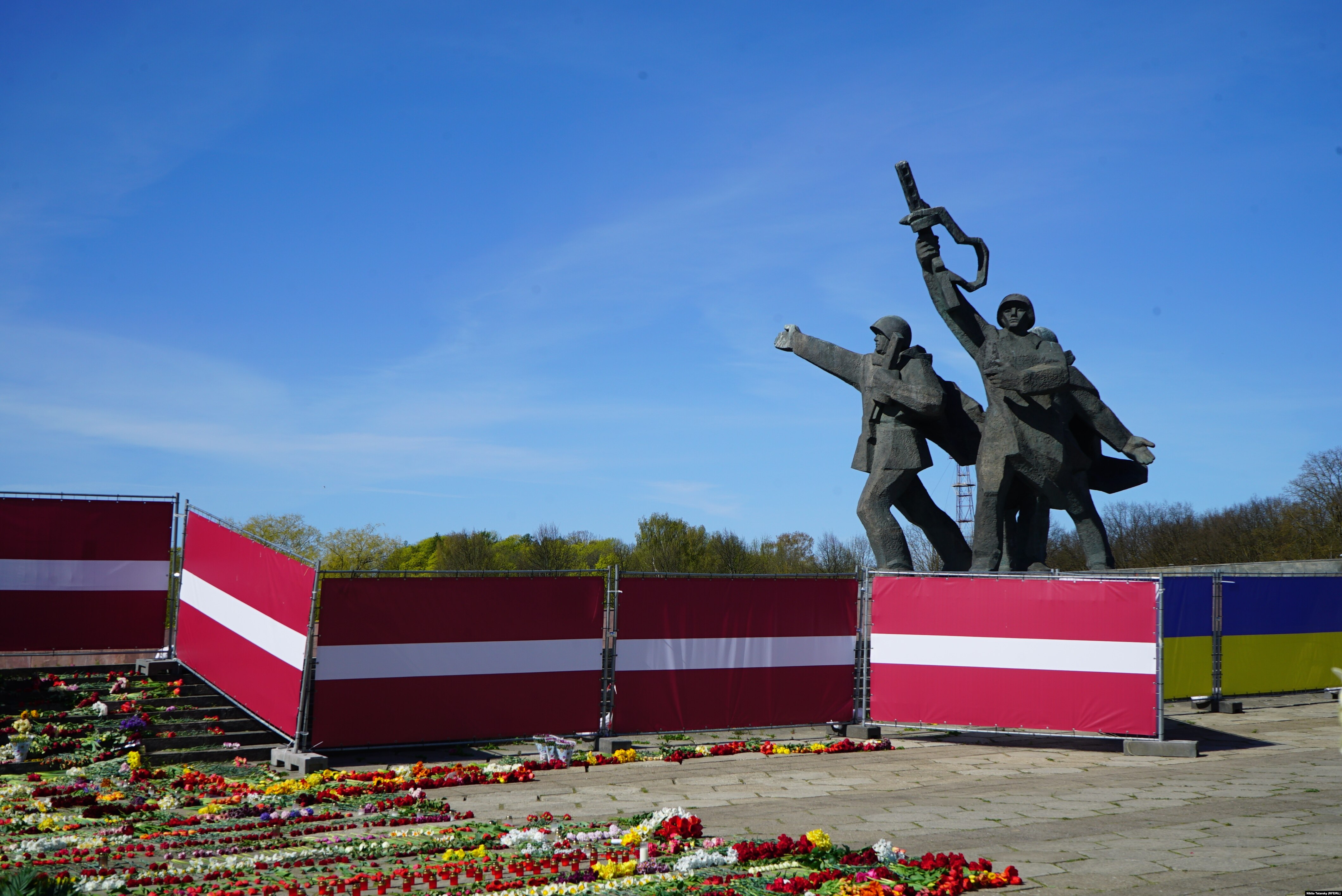 В рижском Парке Победы, где в 1985 году был установлен памятник воинам советской армии – освободителям Советской Латвии и Риги от немецко-фашистских захватчиков, полно полицейских и очень много латышских и украинских флагов. Несмотря на продолжающиеся антиковидные ограничения и просьбы со стороны властей "не создавать картинку для пропагандистских телеканалов", людей с цветами тоже очень много. Проход к стеле огорожен, цветы отдают полицейским, которые укладывают их ровными рядами. Месяц назад памятник воинам-освободителям специальная комиссия признала небезопасным, вокруг него установили забор и вопрос о его сносе уже даже не стоит на повестке: городские власти его снесут, это только вопрос времени.