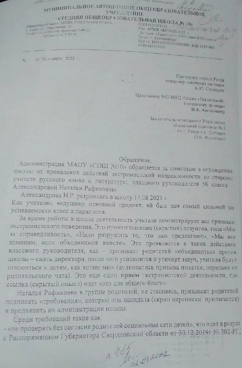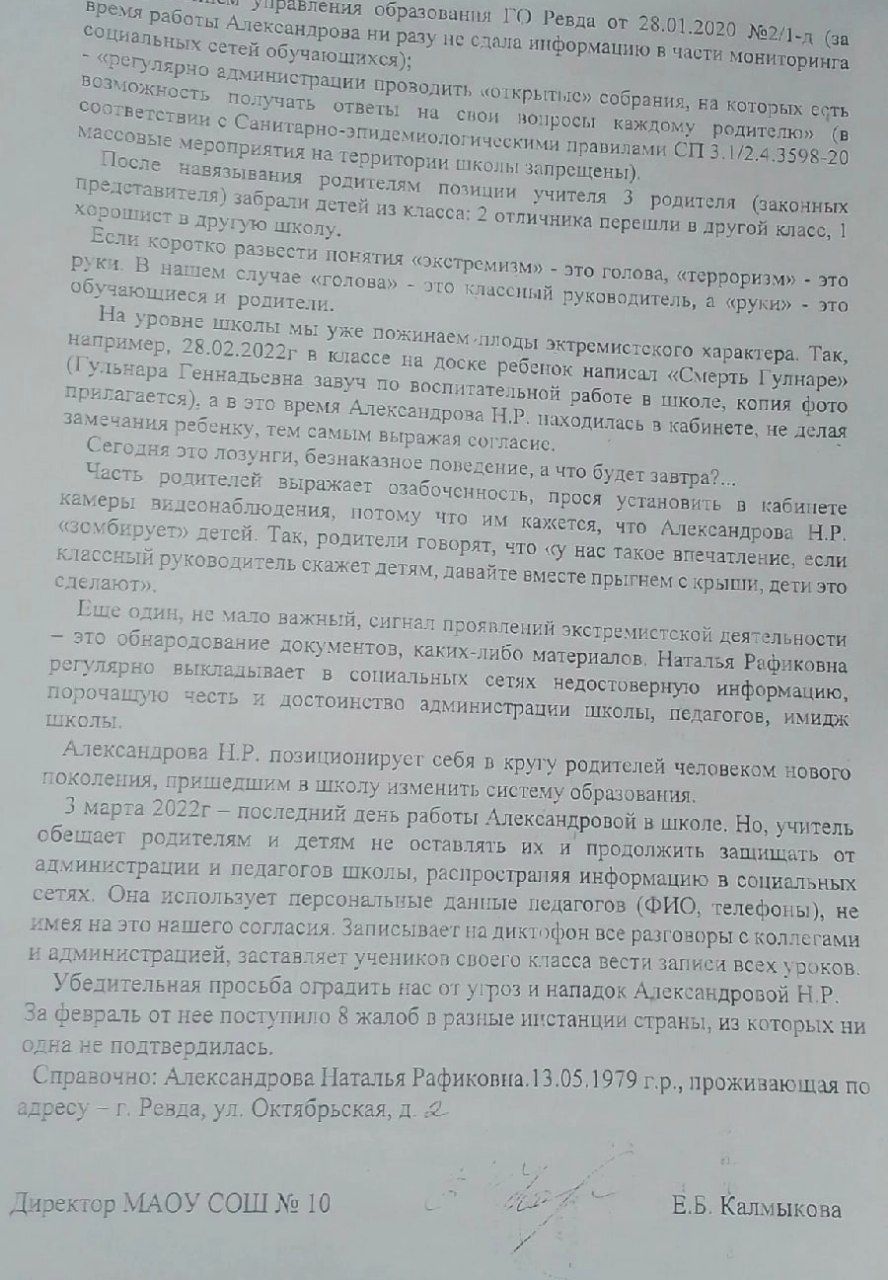 Спустя несколько дней директор школы Евгения Калмыкова обратилась с заявлением в полицию, органы опеки и прокуратуру, в котором сообщила о неких действиях экстремистской направленности, которые якобы я предпринимаю. Экстремизмом, по мнению директора, является моё нежелание мониторить социальные сети учащихся без согласия родителей, а также моё предложение регулярно проводить родительские собрания, на которых получать от руководства учебного заявления ответы на все интересующие вопросы. В документе также сказано, что во время работы я провозглашала некие «скрытые лозунги», и, по мнению родителей, «зомбировала» детей. Разумеется, никакого состава правонарушения или преступления здесь нет, правоохранители вынесли отказной материал.