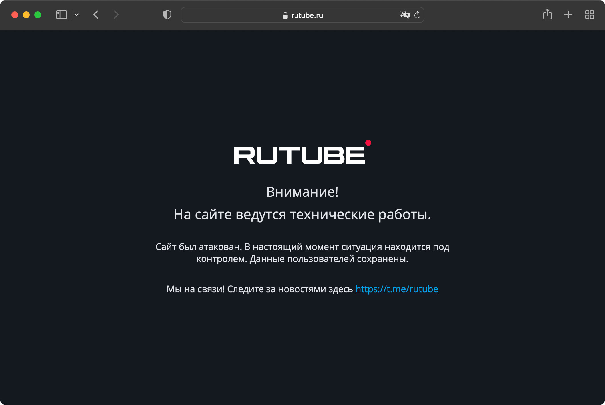 Российский видеосервис Rutube был взломан утром 9 мая. Сообщение о «мощной кибератаке» появилось в телеграм-канале хостинга около 7:00 мск. Rutube заявил, что работает над восстановлением доступа к сервису. Через час хостинг заявил, что «локализовал инцидент», и пообещал сообщить о сроках восстановления в ближайшее время. Около 18:00 пресс-служба Rutube сообщила, что данные пользователей сохранены, ведутся технические работы. Аналогичное сообщение опубликовано на сайте сервиса.