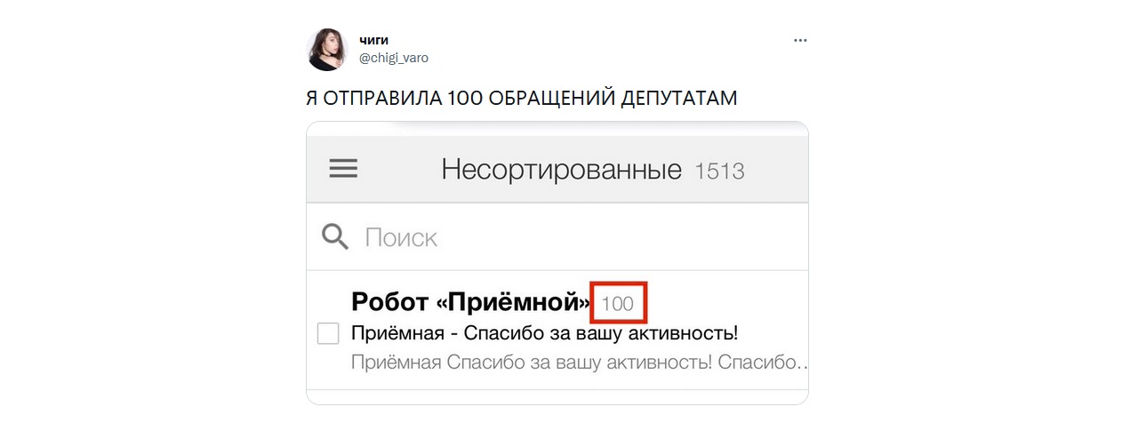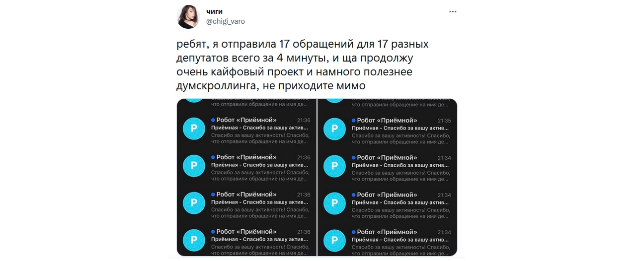 Еще один важный аспект — у нас все полностью легально, тексты обращений проверены юристами, чтобы не было никаких нарушений «закона о фейках» и прочего. Это реально важно: были прецеденты, когда некоторые депутаты в ответ на обращение заявляли, что оно содержит состав какого-нибудь правонарушения. У нас с этим все хорошо, все проверено, нам важно никого не подставлять.
