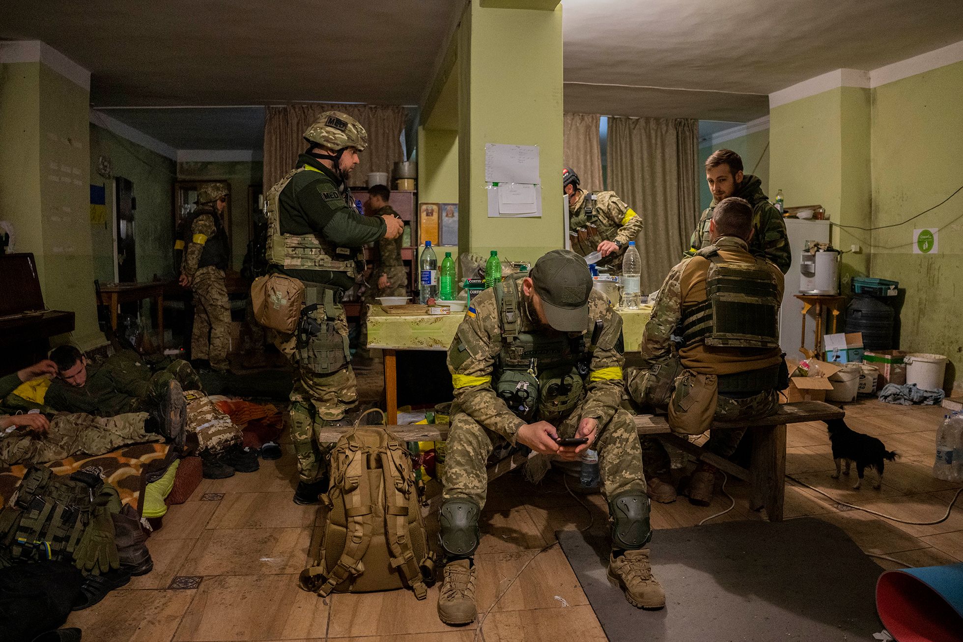 Солдаты Национальной гвардии Украины во временном жилище в одном из отвоеванных сел на окраине Харькова, 14 мая.