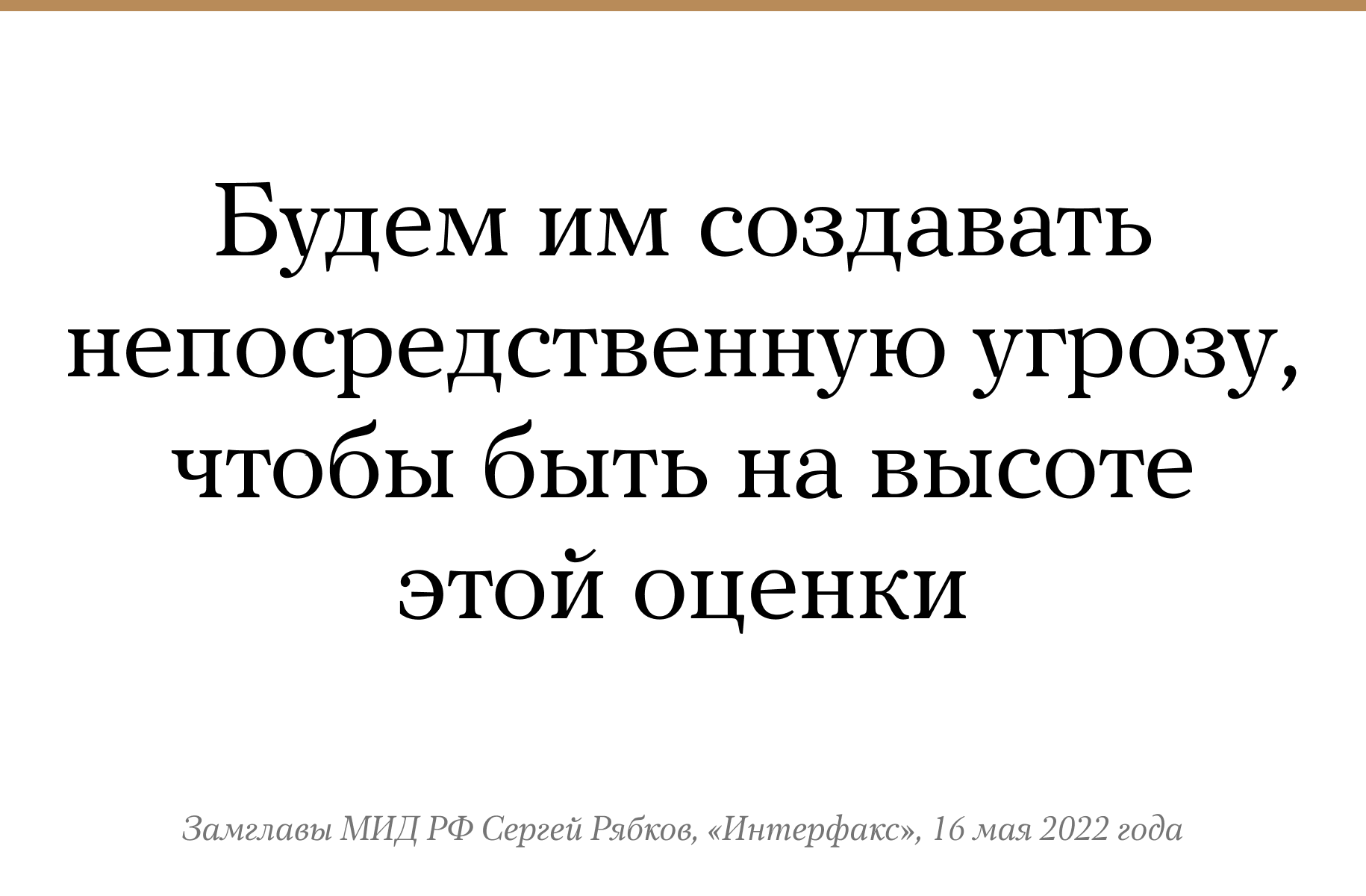 Заместитель министра иностранных дел РФ Сергей Рябков прокомментировал «Интерфаксу» планы НАТО обозначить действия России как «прямую угрозу» (или «непосредственную угрозу»). Рябков заявил, что Россия будет «создавать непосредственную угрозу» НАТО, чтобы соответствовать такой оценке. В прежней концепции НАТО, принятой в 2010 году, Россия была обозначена там как «партнер». 15 мая Финляндия, которая имеет более 1200 километров общей границы с Россией, а также Швеция официально объявили, что подадут заявки на вступление в НАТО.