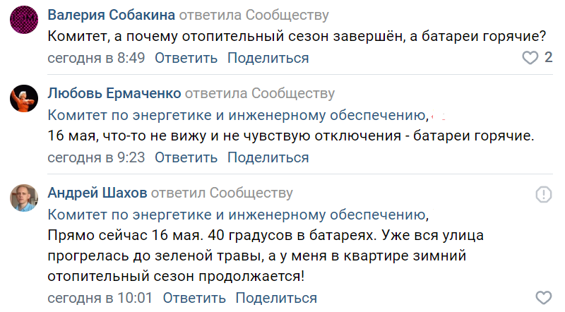 В Петербурге обещали отключить отопление 15 мая, но в некоторых домах оно всё работает. В Смольном пояснили, что решение принимают управляющие компании. Ответ опубликовала «Фонтанка».