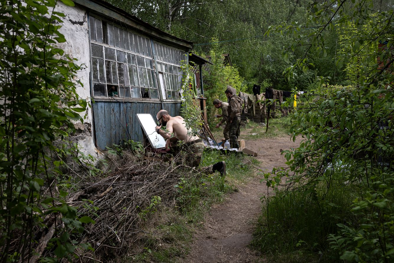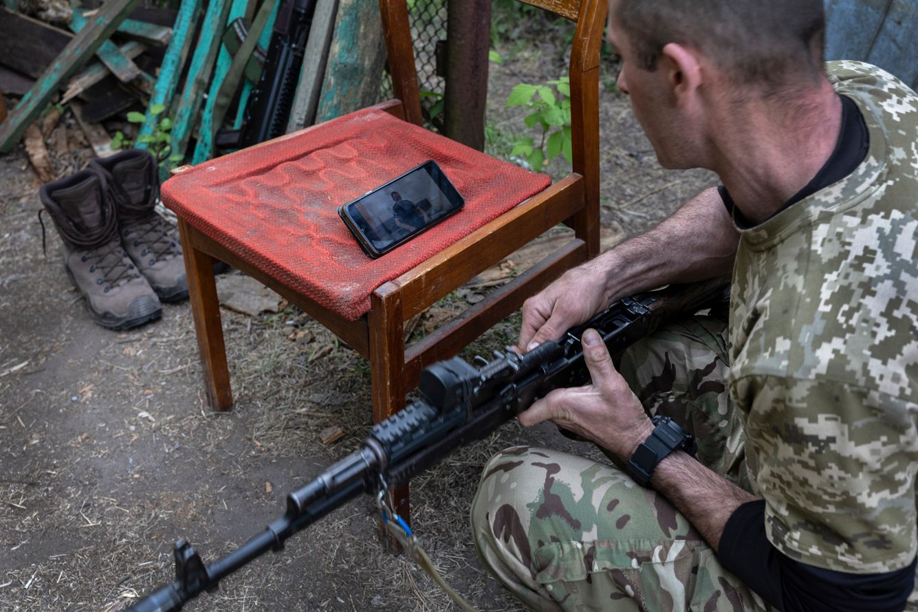 John Moore / Getty Images Недавно мобилизованный военнослужащий ВСУ на фронте смотрит видеоинструкцию по сборке-разборке и чистке оружияJohn Moore / Getty Images Военнослужащие ВСУ обустраивают быт на участке недалеко от линии фронта